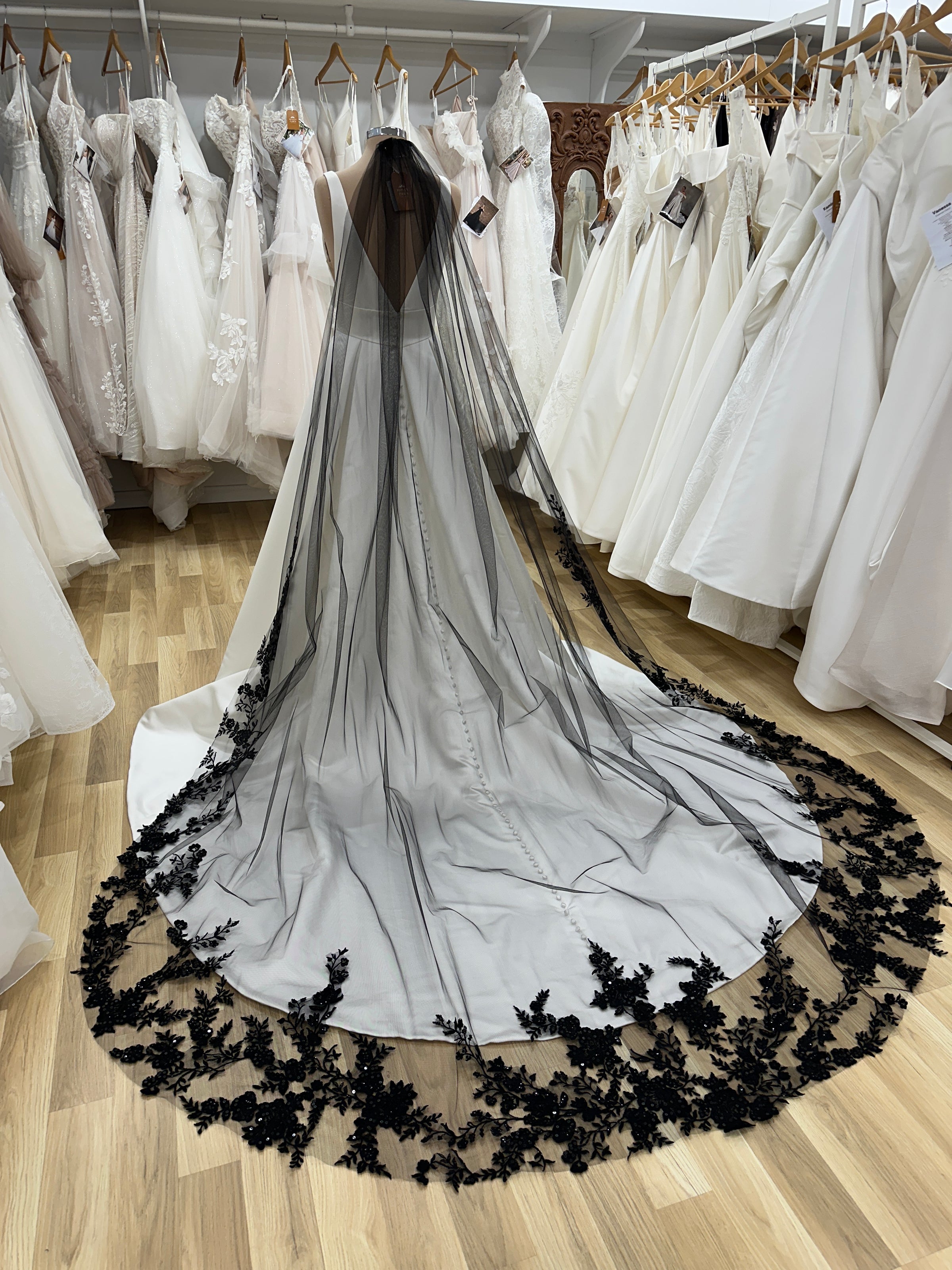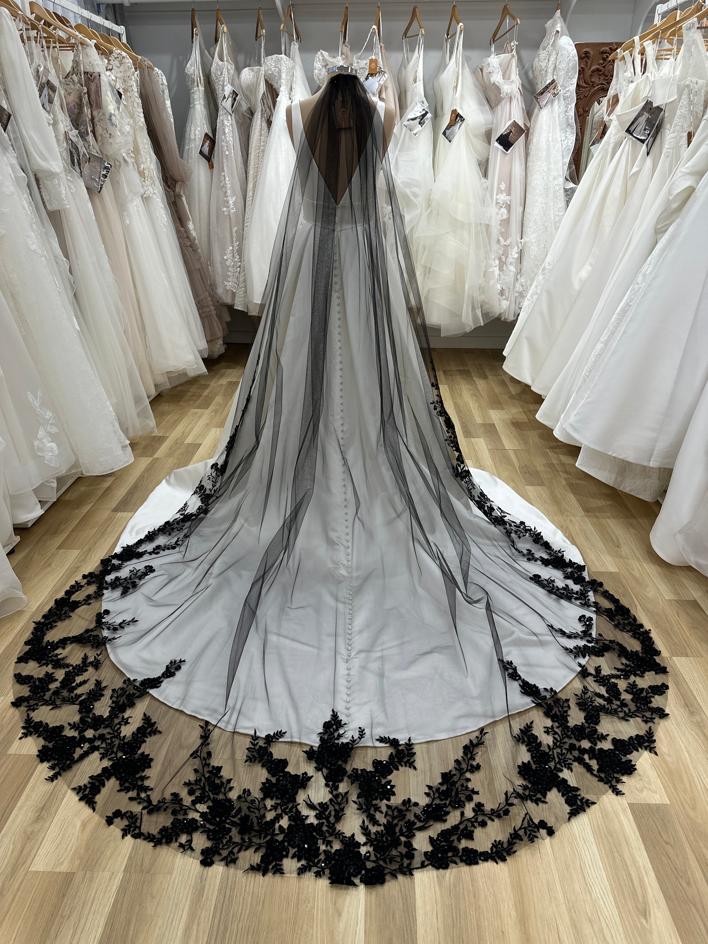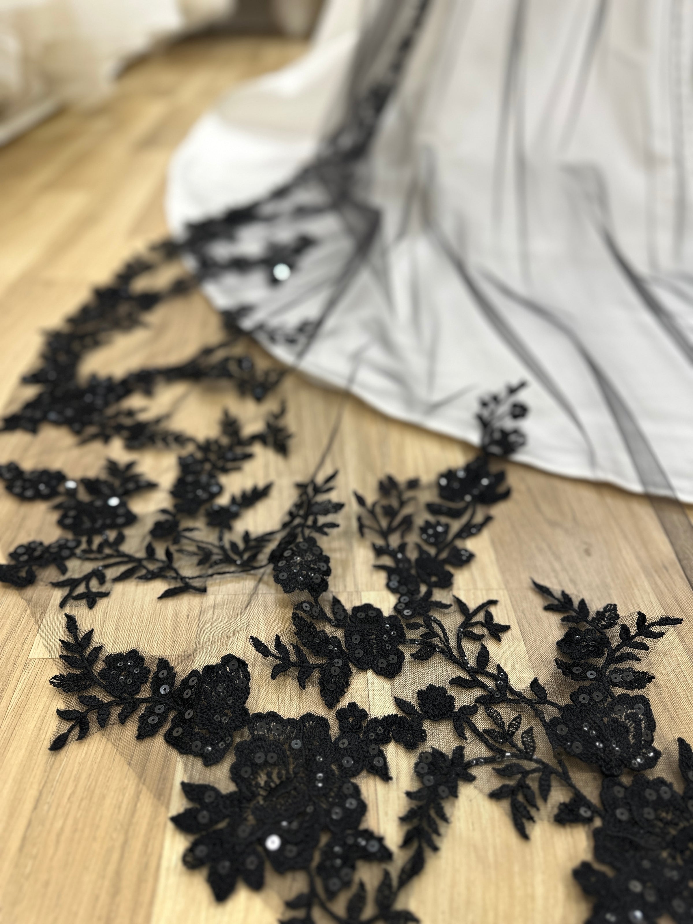 A veil of black tulle adorned with lace and sequins, cascading in a cathedral length. Perfect for a bold and unique touch to any bridal ensemble.