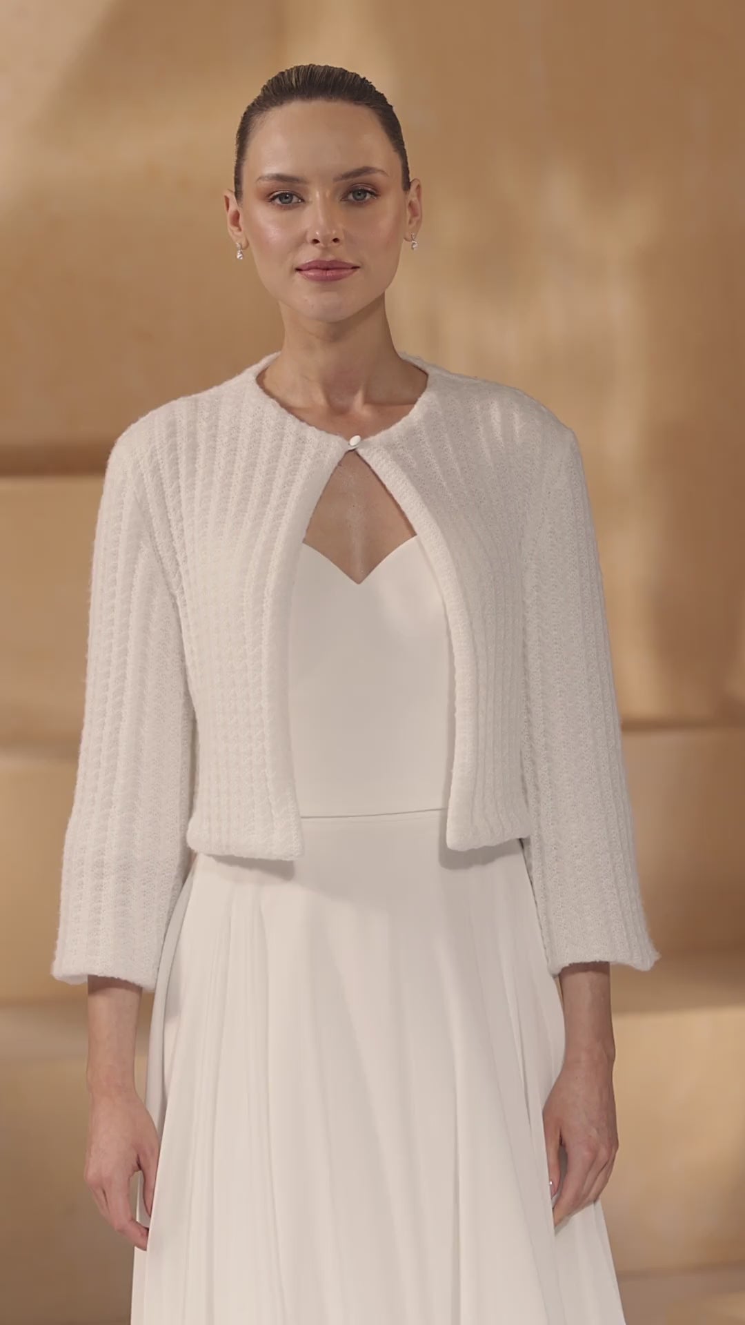 Each cardigan is meticulously designed in Europe and manufactured at Bianco Evento's dedicated in-house production facility, ensuring exceptional quality and attention to detail. This commitment to craftsmanship guarantees a garment worthy of your special day.