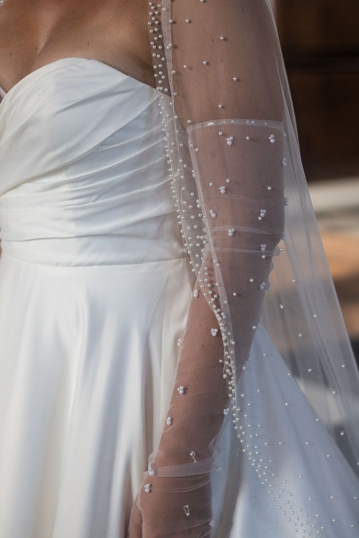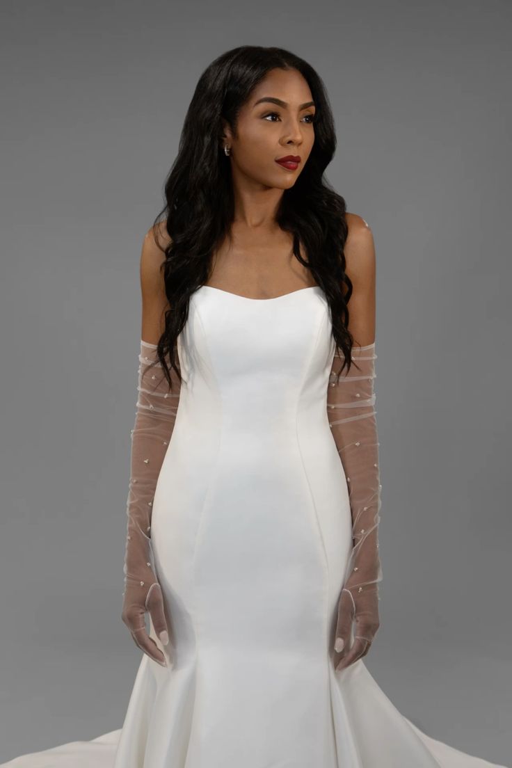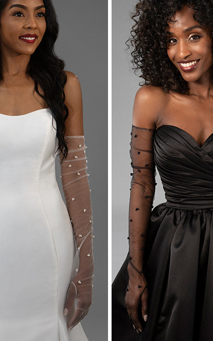 Get your bridal look on point with these Nellie Tulle Gloves, featuring scattered pearl beads and full fingers. The rubber edging ensures they won't slip off during the day. Add a touch of elegance and whimsy to your outfit with these stunning gloves.