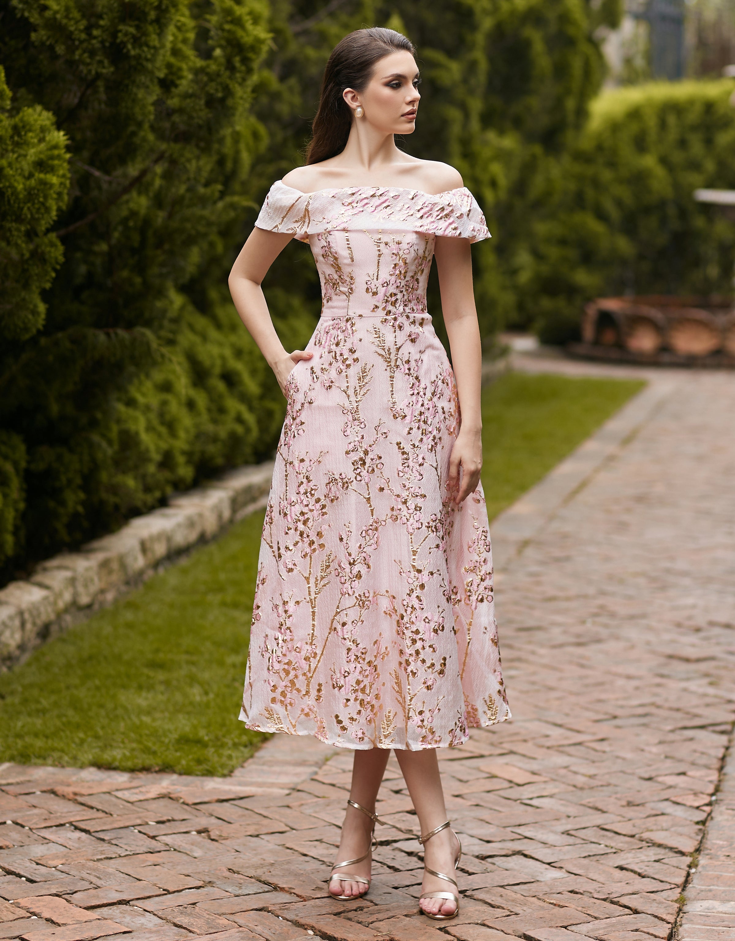 Rock the Off-Shoulder look with this Metallic Jacquard bodice, complete with side seam pockets and an A-line skirt perfect for any party or wedding guest!