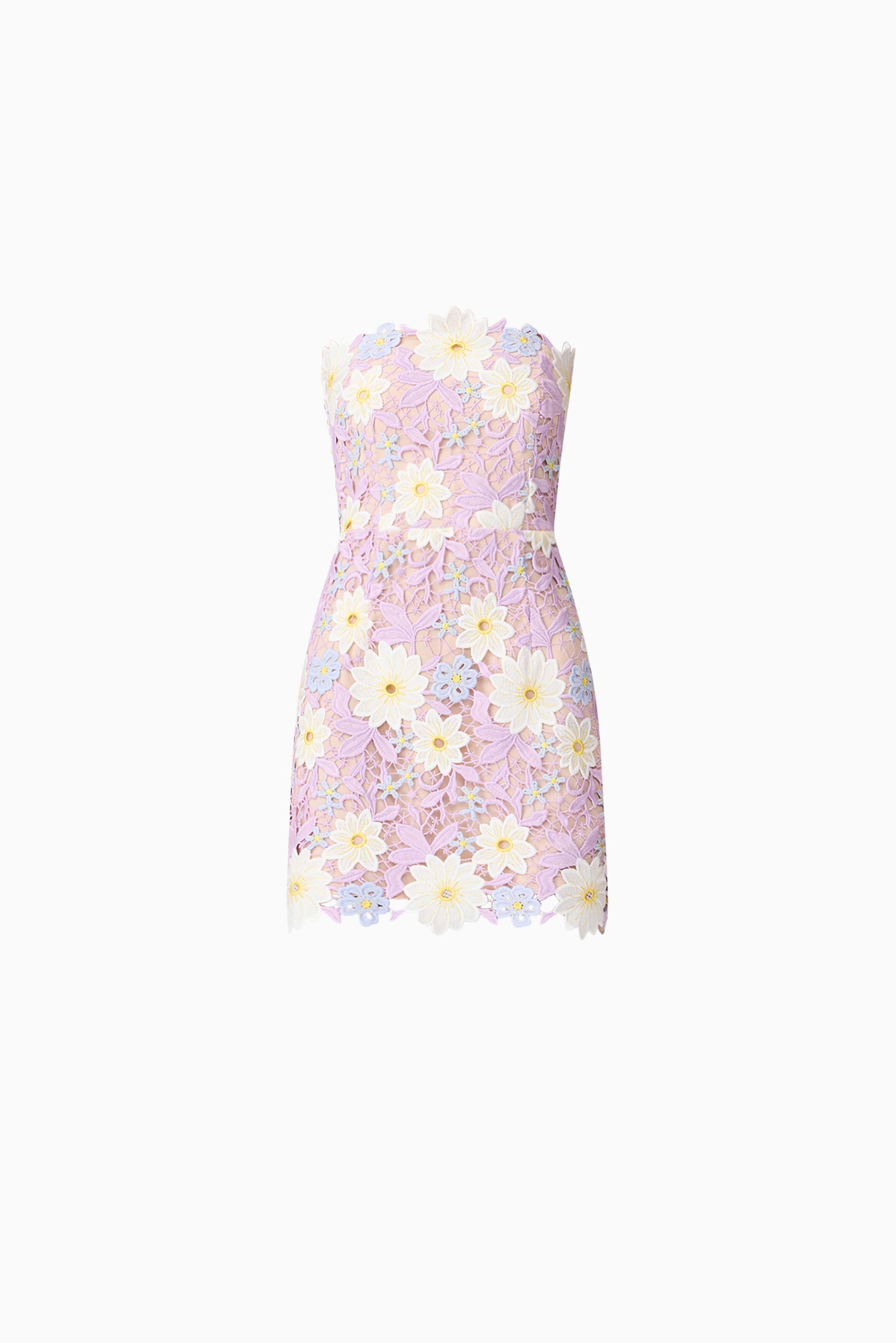 Make a striking impression in the Sigrid Strapless Mini Dress in Purple, worn by our brunette model in a front-facing shot. This fitted mini dress is crafted from luxurious guipure lace fabrication, offering exquisite texture and timeless appeal.