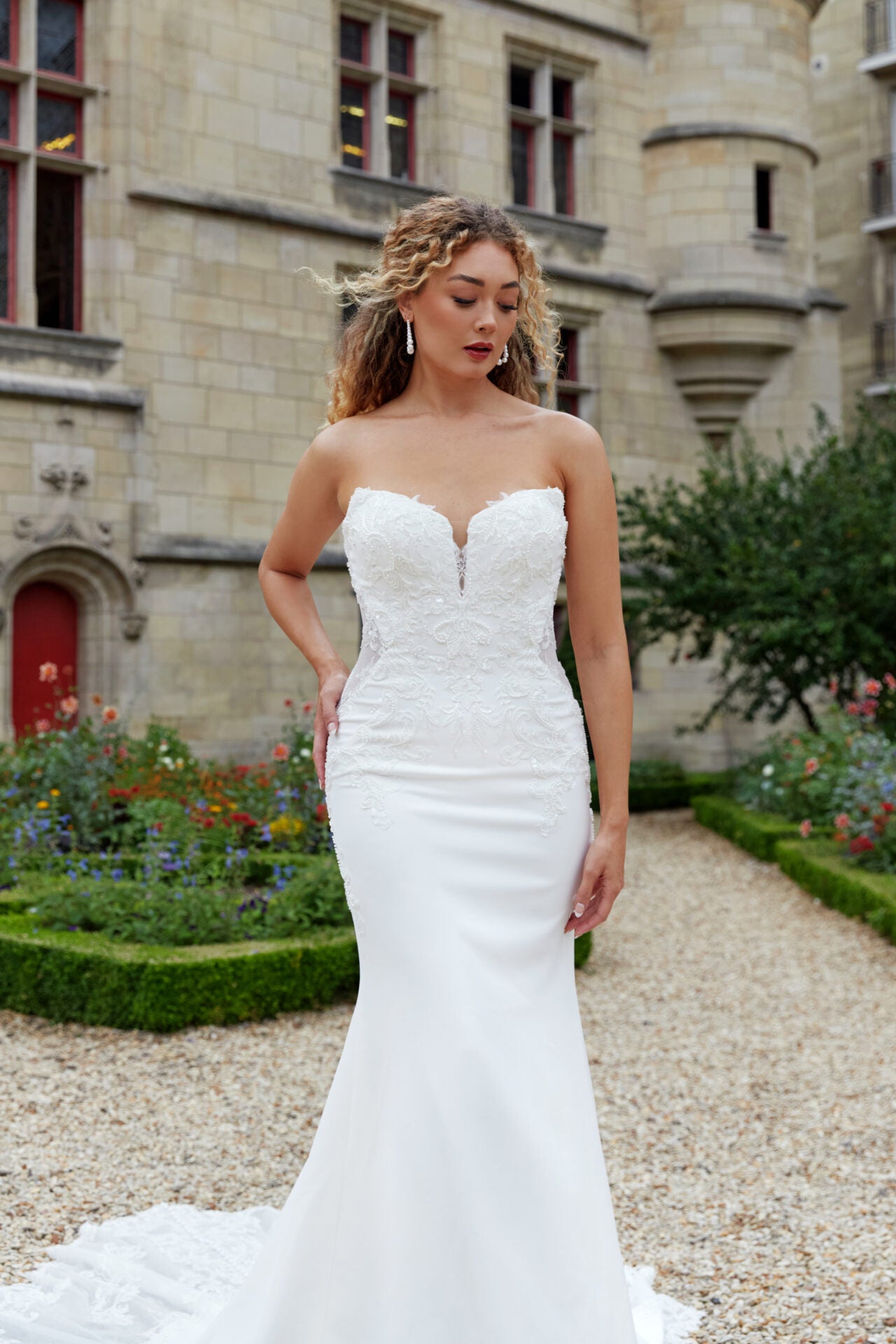 Capturing the romance and beauty of timeless bridal design, Style D3853 features a flattering column silhouette of graphic lace applique and crepe. The strapless sweetheart neckline plunges into the embellished lace-adorned bodice and seamlessly meets a sheer open back detail with a gown-length row of vintage-inspired pearl buttons. Stretch crepe fabric melts over the figure to meet a glitter tulle cutout train of delicate lace applique to complete this romantic wedding dress.