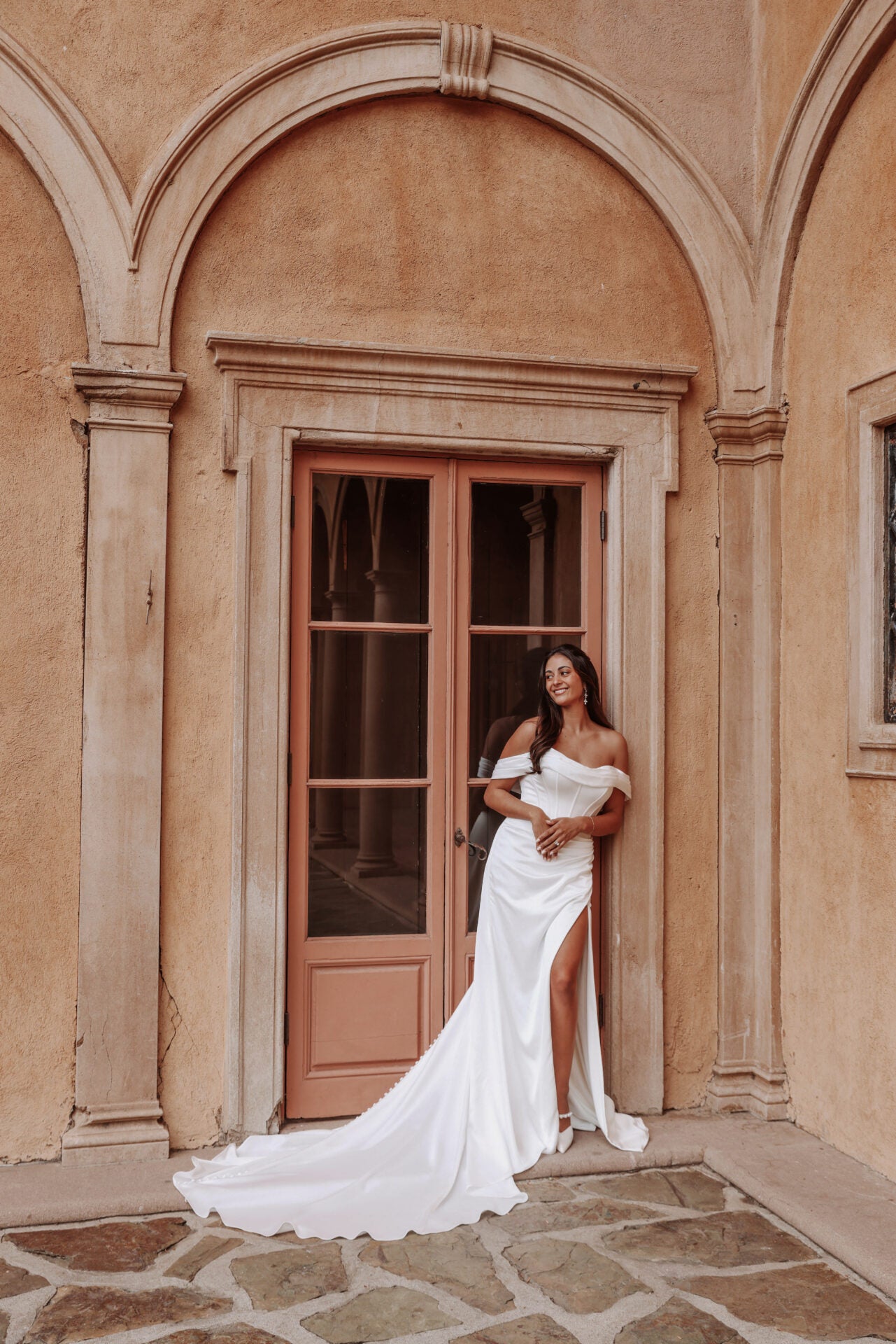 GLAMOROUS OFF-THE-SHOULDER FIT-AND-FLARE WEDDING DRESS WITH OPTIONAL LEG SLIT
