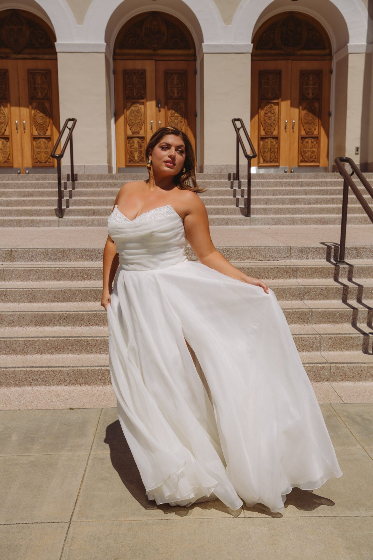 Both soft and modern, Style D4124 artfully blends wispy layers of organza with contemporary fashion design for a unique fashion-forward bridal gown. The strapless scoop neckline shimmers with pearl beading as soft organza drapes the corset bodice that is available as a sheer unlined option or more modest fully lined version. The illusion back mirrors the front with scattered pearls that meet at the waist. The A-line silhouette takes shape as long organza sheets float above the floor, opening for a sexy thigh-high leg slit. Epitomizing sleek simplicity, this pearl-embellished gown is perfect for the fashion-forward bride. This wedding gown is available in plus size.