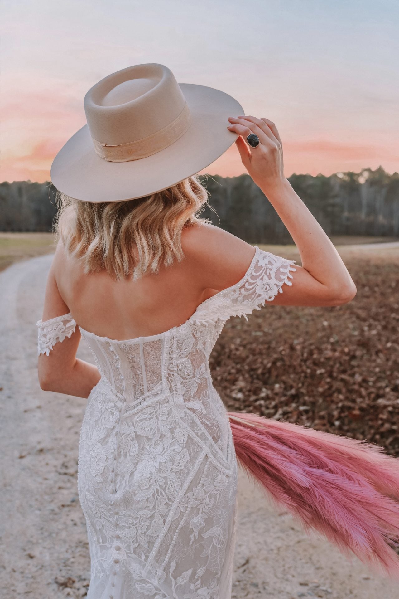 Arianna embraces the classic elements of bridal fashion with a silhouette made for today’s modern bride. Vintage-inspired lace patterns cover this bridal gown from head to toe, with striking linear curves and lines accentuating the body’s beautiful form. The plunging sweetheart neckline includes illusion tulle for a sexy look without sacrificing support. Encrusted beaded details on the bodice add a subtle shimmer, and along the sides and back of the bodice, a corset-inspired structure features sheer sexy cutouts. For a final bridal touch, fabric-covered buttons trail to the end of the stunning lace-adorned train. Easily styled for the traditional, modern or boho bride, this gown has a little bit of everything.