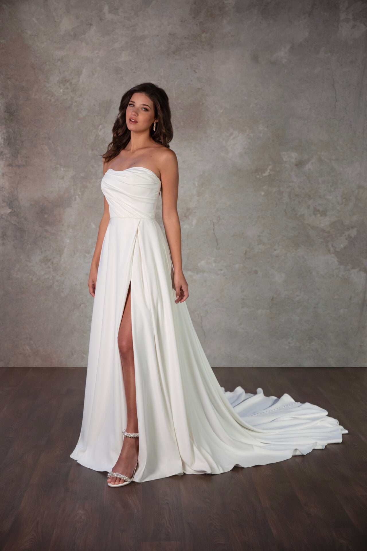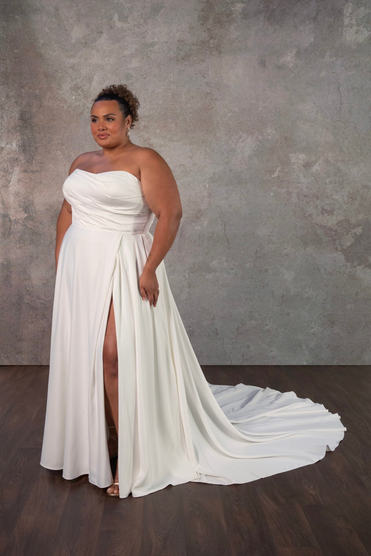 Minimalist chic takes center stage in Style D4225, a simple strapless satin wedding dress with ancient Greek goddess vibes. Featuring a clean and chic look, the lined bodice drapes beautifully over the figure, joining a classic A-line skirt that gently cascades over the hips, opening into an alluring leg slit for effortless movement and grace. Also available in plus sizes, this draped wedding gown offers a perfect blend of simplicity and sophistication for a refined bridal look for the modern bride.