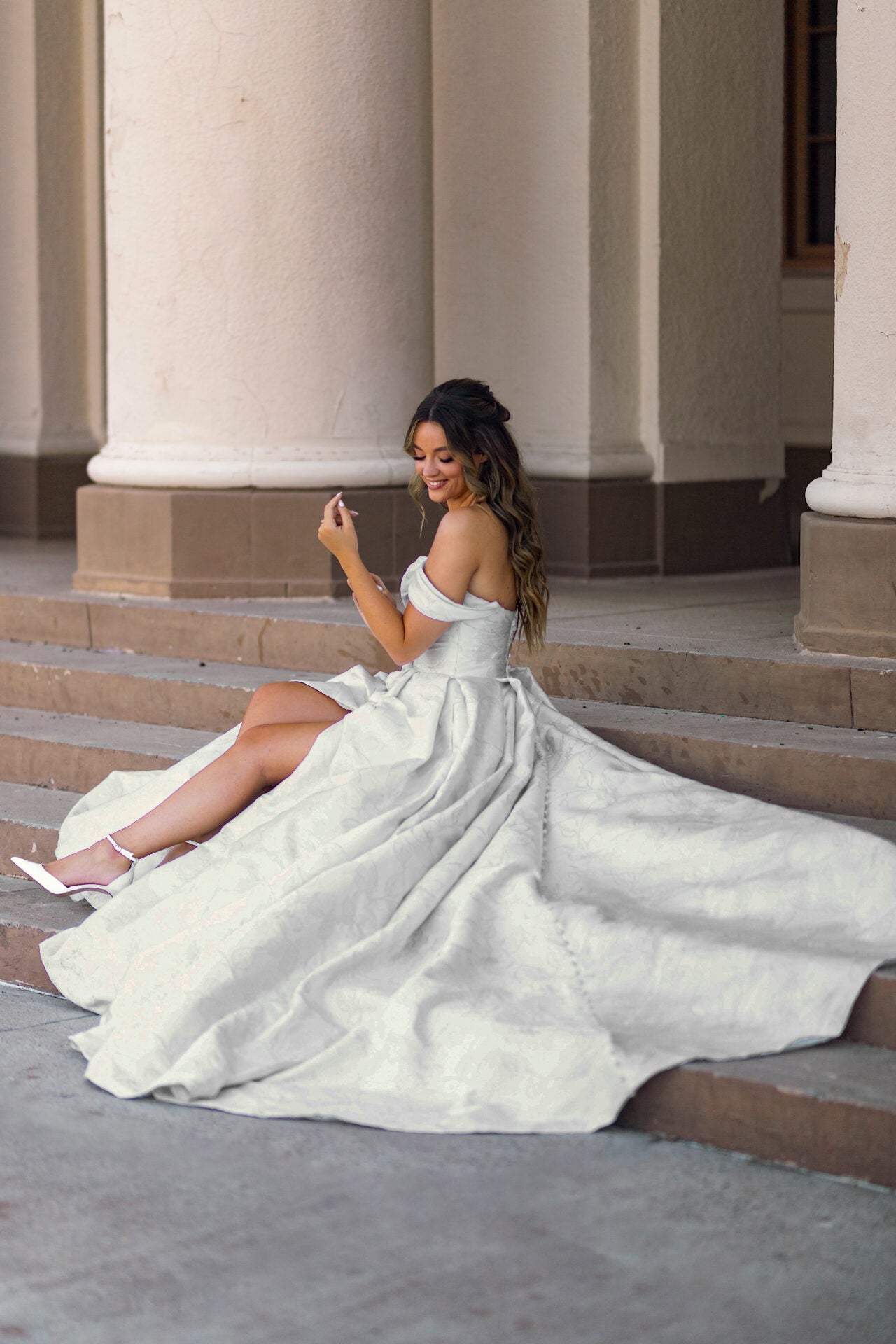 Combining luxe satin with unique sparkling embroidered floral details, Style D4187 introduces a fashionable off-the-shoulder satin wedding dress thats both runway and aisle ready. Detachable off-the-shoulder straps gracefully drape over the arms, attaching to strapless bodice with a straight-across neckline. Elegant draping wraps the figure in a flattering fitted silhouette, while a modest back introduces timeless fabric-covered buttons that extend to the hem. With pockets and a daring leg slit, the full A-line skirt offers a modern and refined touch to this glamorous satin wedding gown. Available in classic ivory, black or modern metallic mist as well as plus sizes.