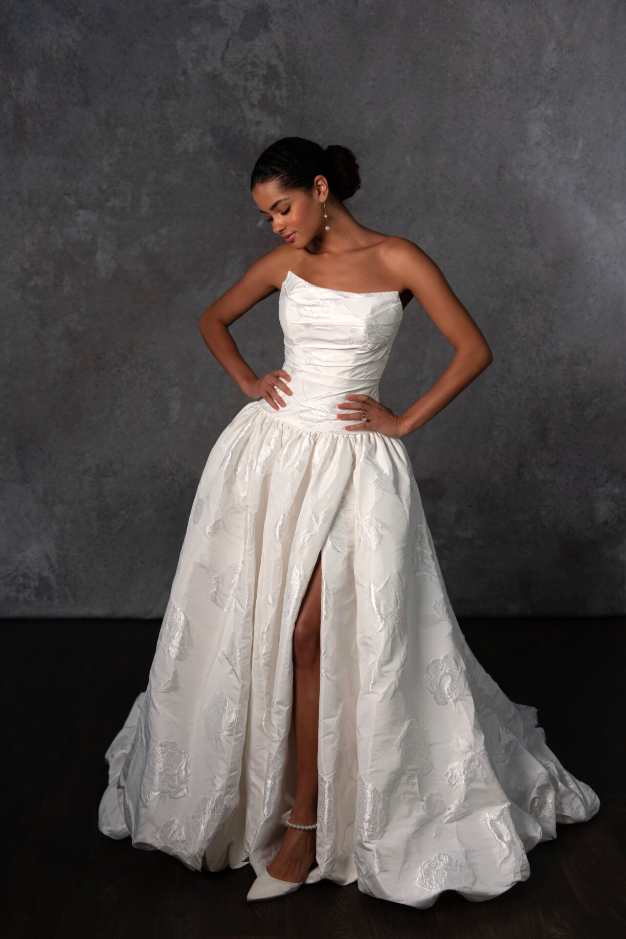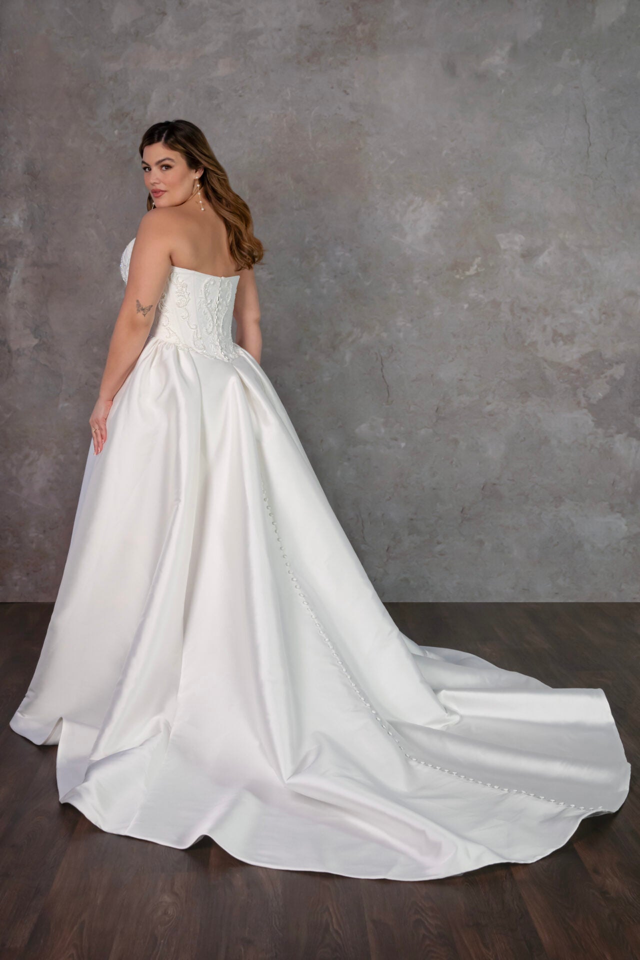 Style D4325 brings a modern fairytale to life with its runway-ready design and timeless romance. The strapless scoop neckline bodice is elegantly ruched in luxurious taffeta, creating a sculpted and sophisticated look. A dropped waistline enhances the silhouette, offering a dreamy and fashion-forward appeal. In the back, a classic row of fabric-covered buttons trails from neckline to hem, adding a touch of vintage elegance. From the waist, a voluminous ballgown skirt with a statement bubble hem sweeps the floor, delivering an ethereal and dramatic effect. Balancing contemporary design with classic bridal charm, this ultra-romantic wedding gown is also available in plus sizes.