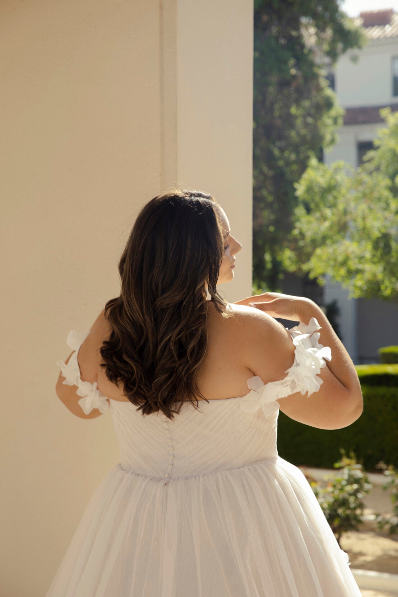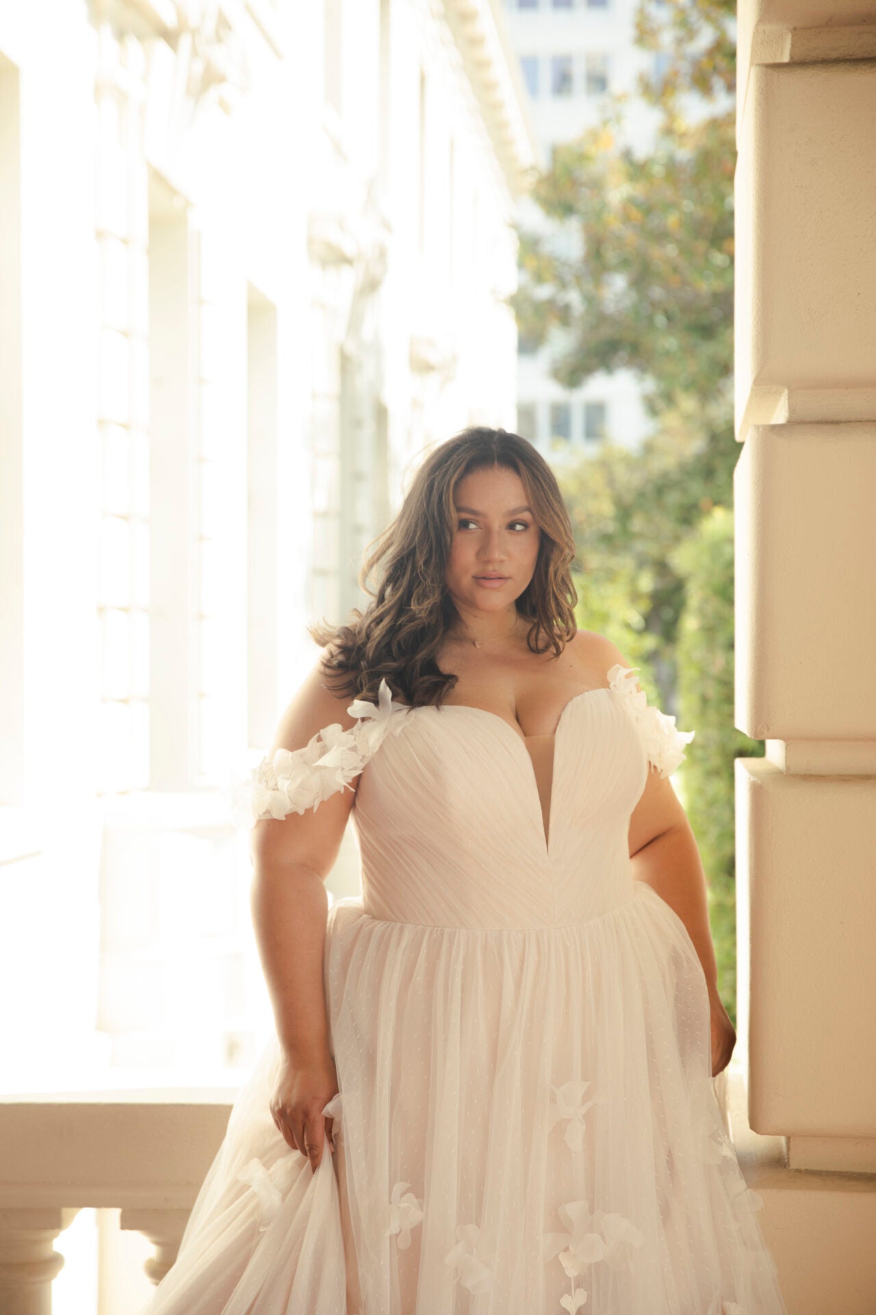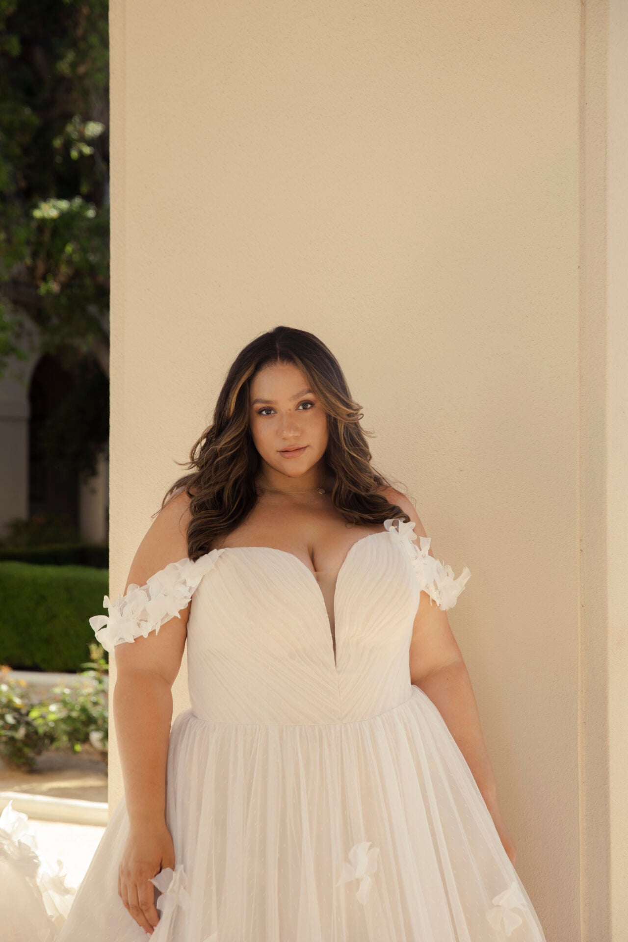 Plucked from the runway and into a modern-day fairytale, Style D3734 is a whimsical ballgown wedding dress made for the fashion-forward romantic. Textured gathered tulle forms a structured sweetheart bodice with a deep plunging neckline and detachable 3D floral straps. From the fitted waist, a whimsical tulle ballgown skirt completes the princess silhouette with flecked tulle and delicate 3D floral appliqués that create a dreamlike and utterly romantic wedding dress. This wedding dress is also available in plus sizes and in black.