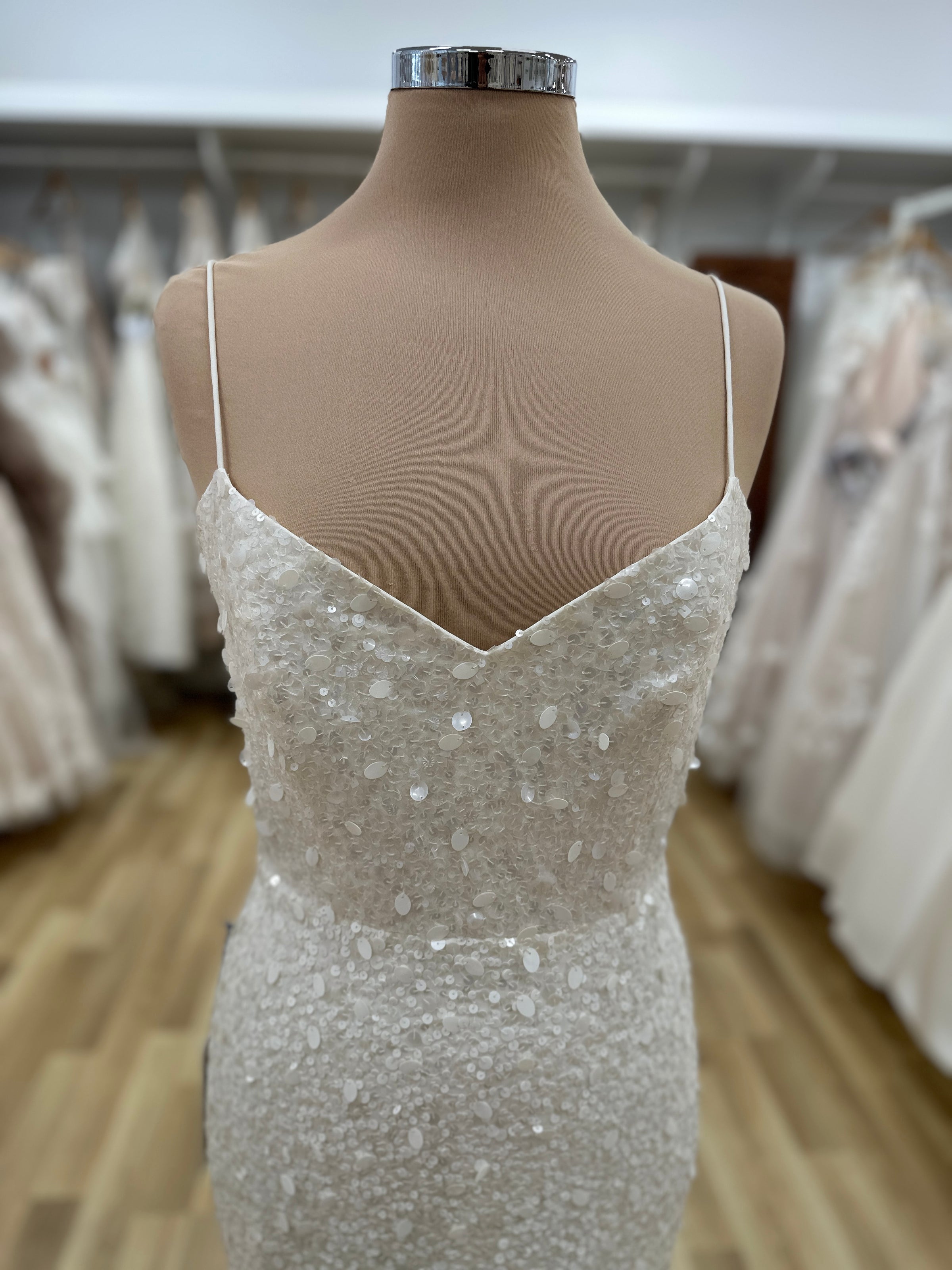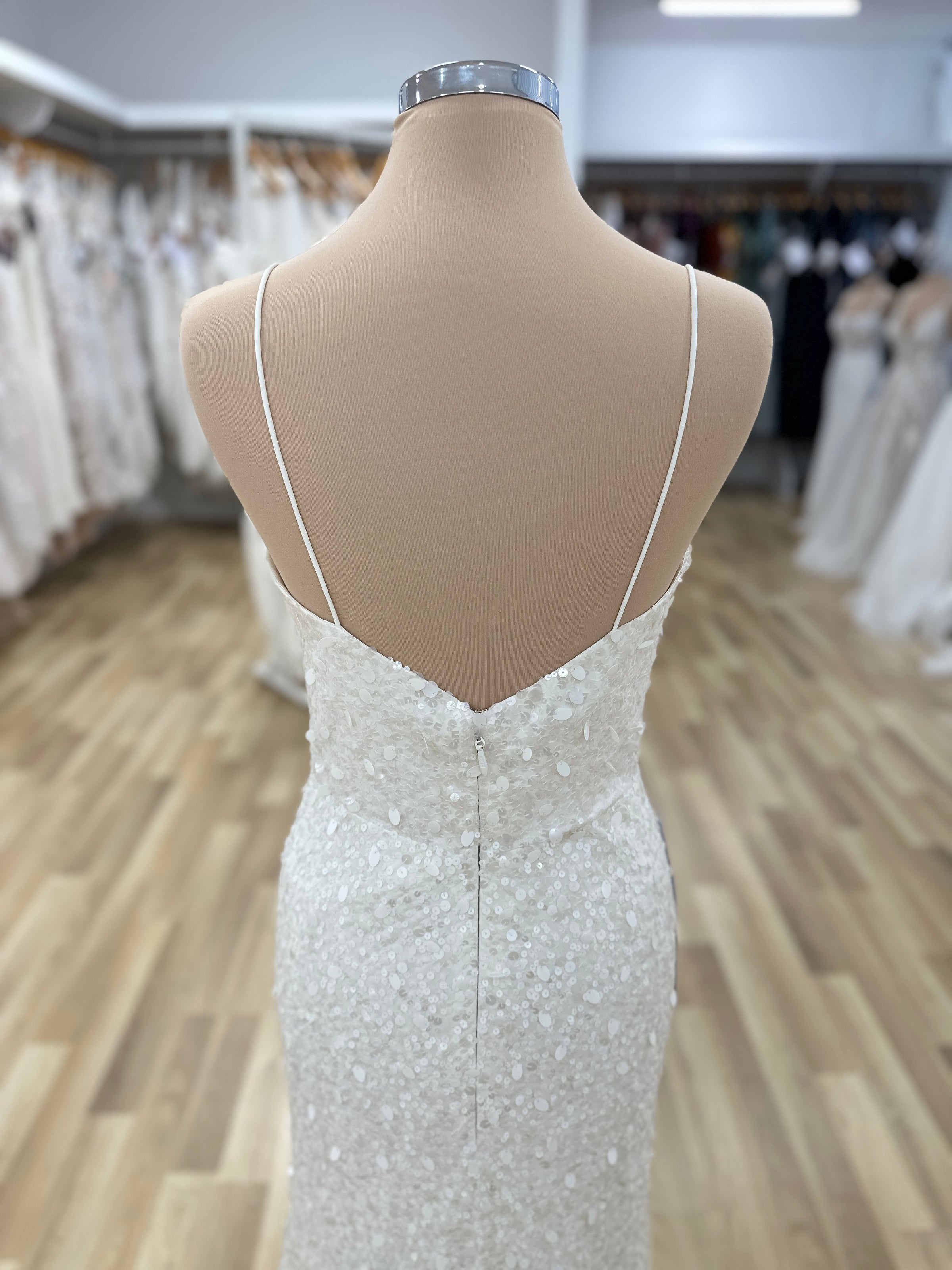 Anya is the ultimate sequin wedding gown. She is iconic to KAREN WILLIS HOLMES and boasts minimalism and elegance. Delicate spaghetti straps and a completely beaded and sequinned bias skirt give you a stunning form-fitting shape. Anya makes for an incredible reception gown too and the perfect gown to shorten after your wedding.