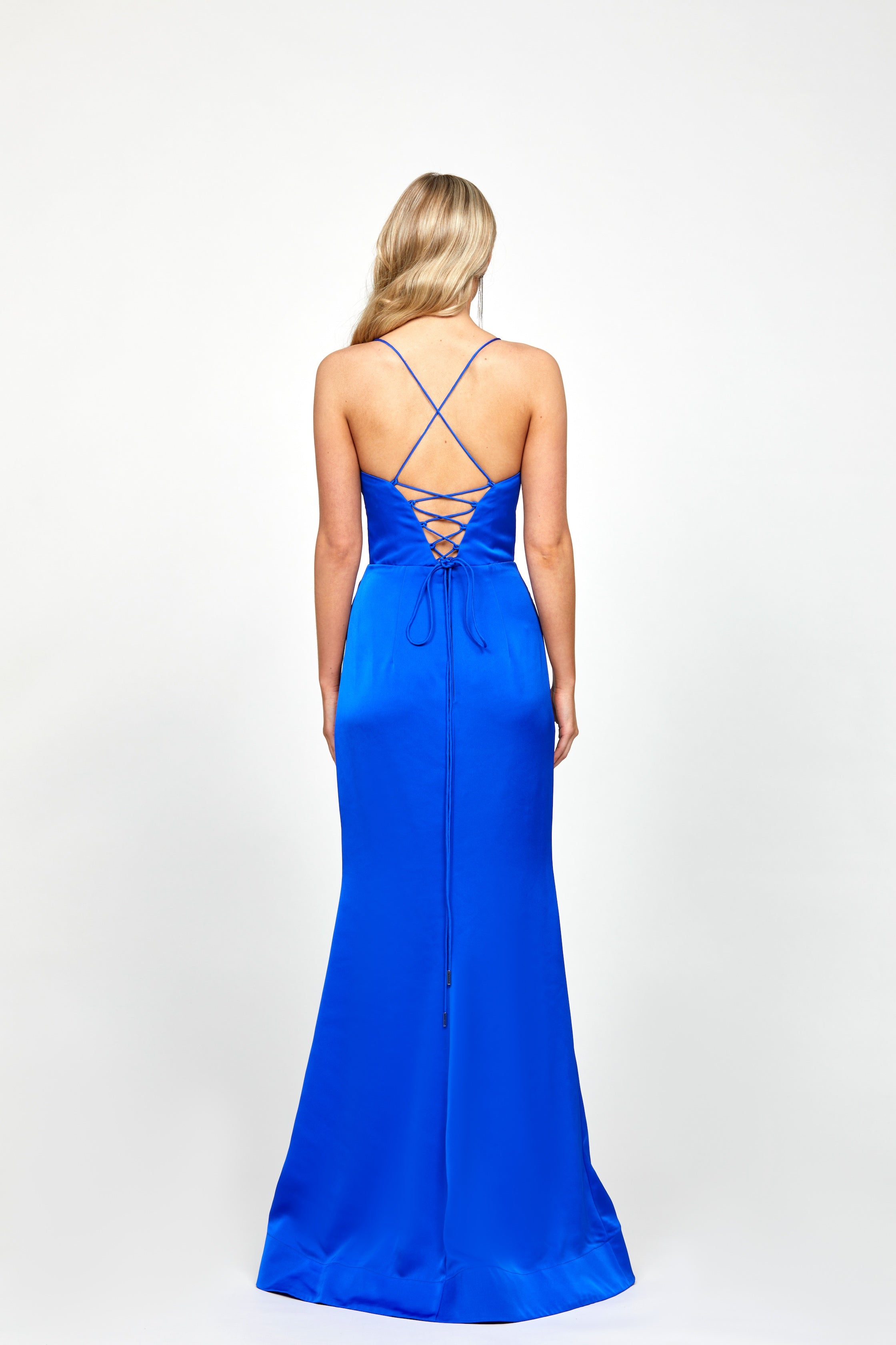 The sheer corset waist adds structure and shape, enhancing your curves with a bold yet feminine touch. An open V-back with an adjustable lace-up feature allows for a perfect, customizable fit, giving the gown a flattering, tailored look from every angle. The full-length fishtail skirt features delicate pleat detailing, adding texture and movement, while a high side front split offers a hint of drama and allure.