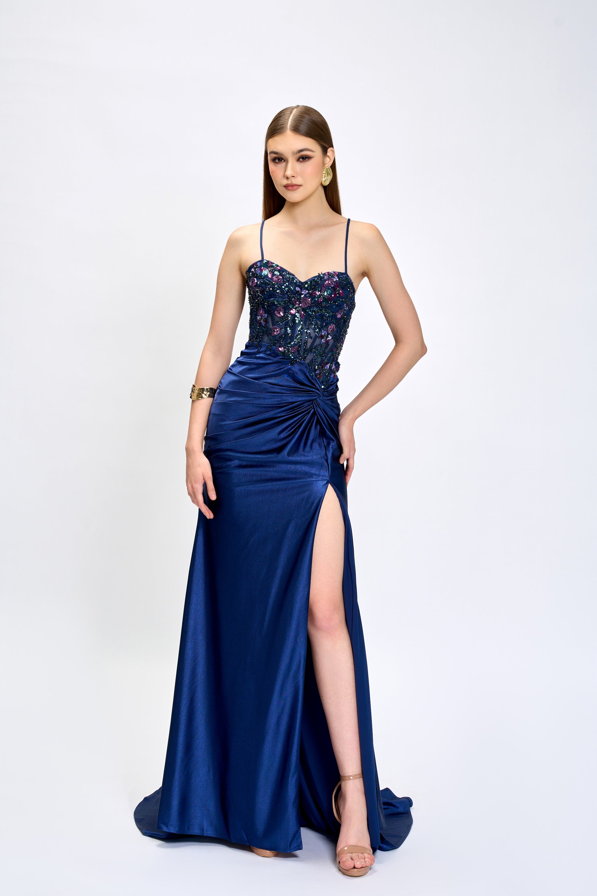 This show-stopping formal gown is pure glamour from every angle! The sweetheart neckline and delicate straps frame the bust beautifully, while the semi-sheer corset—complete with structured boning and dazzling sequin embellishments—creates serious wow factor. The fishtail skirt features an elegant draped knot detail at the side with a dramatic split and flowing back train. Fully lined with a hidden zip for a seamless finish, this stunner is destined to turn heads at any formal event. Trust us, this one won't stick around long!