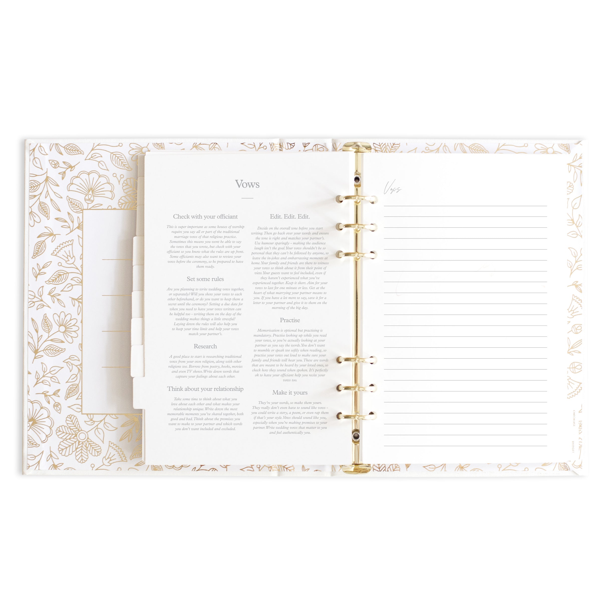 Gold foil stamped white waterproof linen hard cover, designed to last through many months of planning. White elastic and gold ring binder. Foiled tabbed divider pages. Handy document pockets at the front and back for business cards & flyers. 6.9 x 9" (1.4" spine) / 175 x 230mm (35mm spine). Foiled end pages and premium 90gsm FSC-certified paper. Packaged in a cello sleeve with gold foil bellyband. Designed in Australia, printed in China.