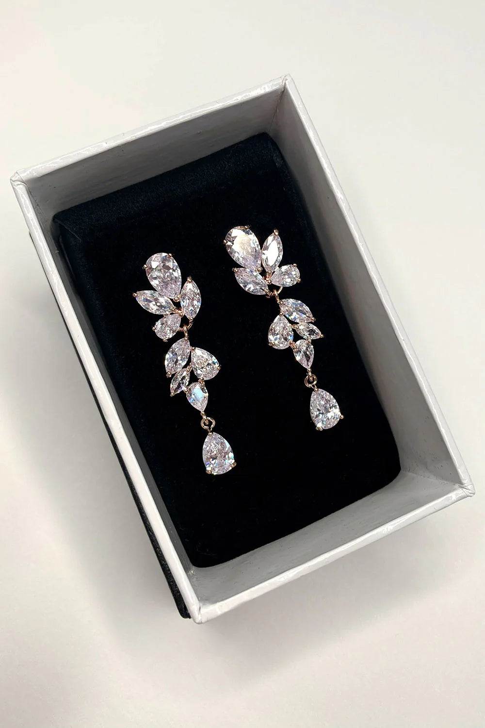 Claire, is a gorgeous mid-length crystal cluster drop earring set in rhodium silver. You'll be ethereally elegant and sparkling in all the right places as you walk down the aisle to find your happily ever after.