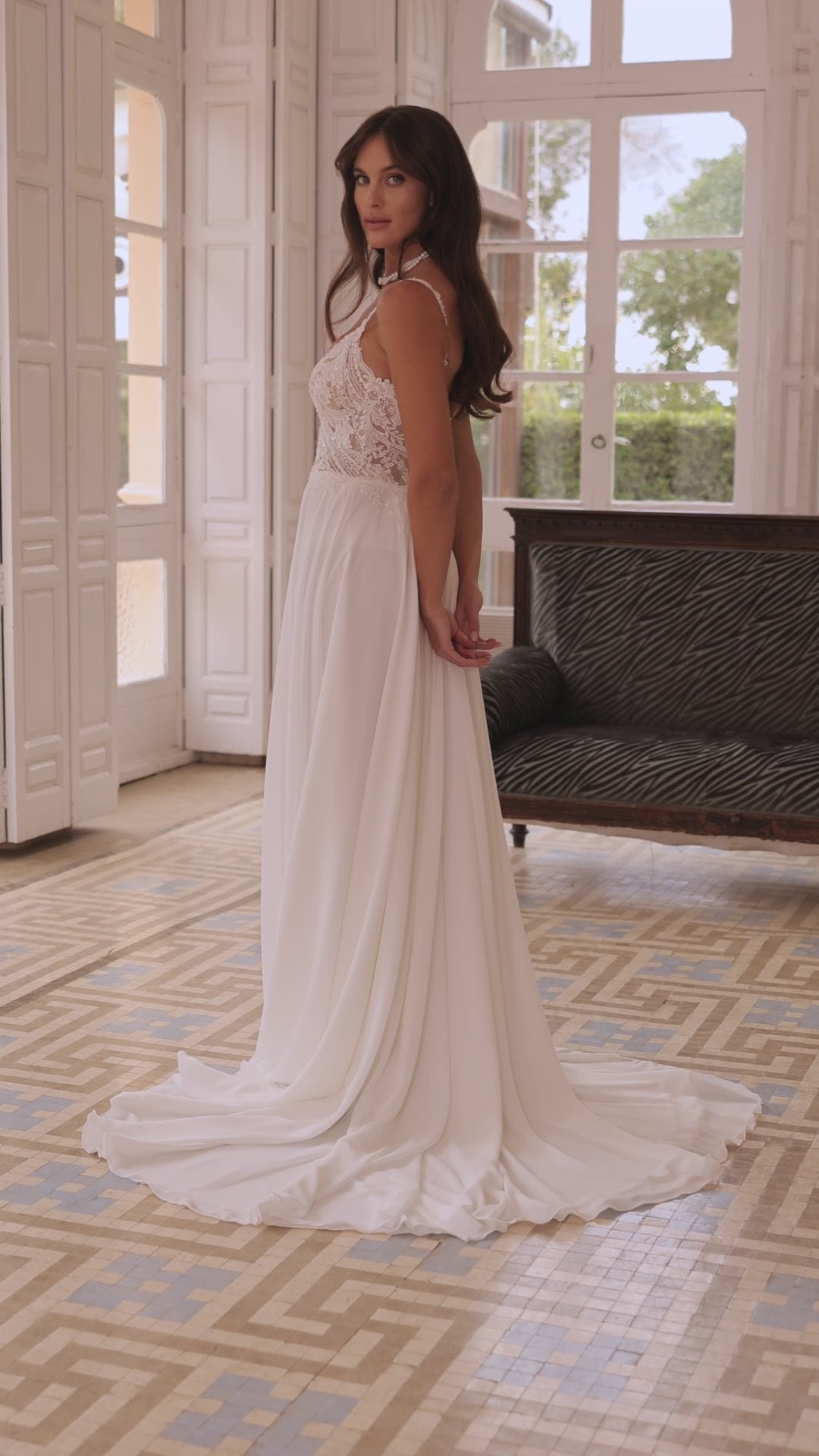 An enchanting lace and chiffon gown with a beaded bodice, delicate spaghetti straps, and a flowing skirt with a side slit. Featuring an illusion back and soft train, this dress is the epitome of modern romance and effortless elegance. A captivating blend of elegance and allure, this wedding gown features a delicate lace bodice with intricate beadwork, accentuated by thin spaghetti straps. The flowing chiffon skirt with a daring side slit adds movement and sophistication. The gown’s illusion back detail and soft train complete its romantic charm.