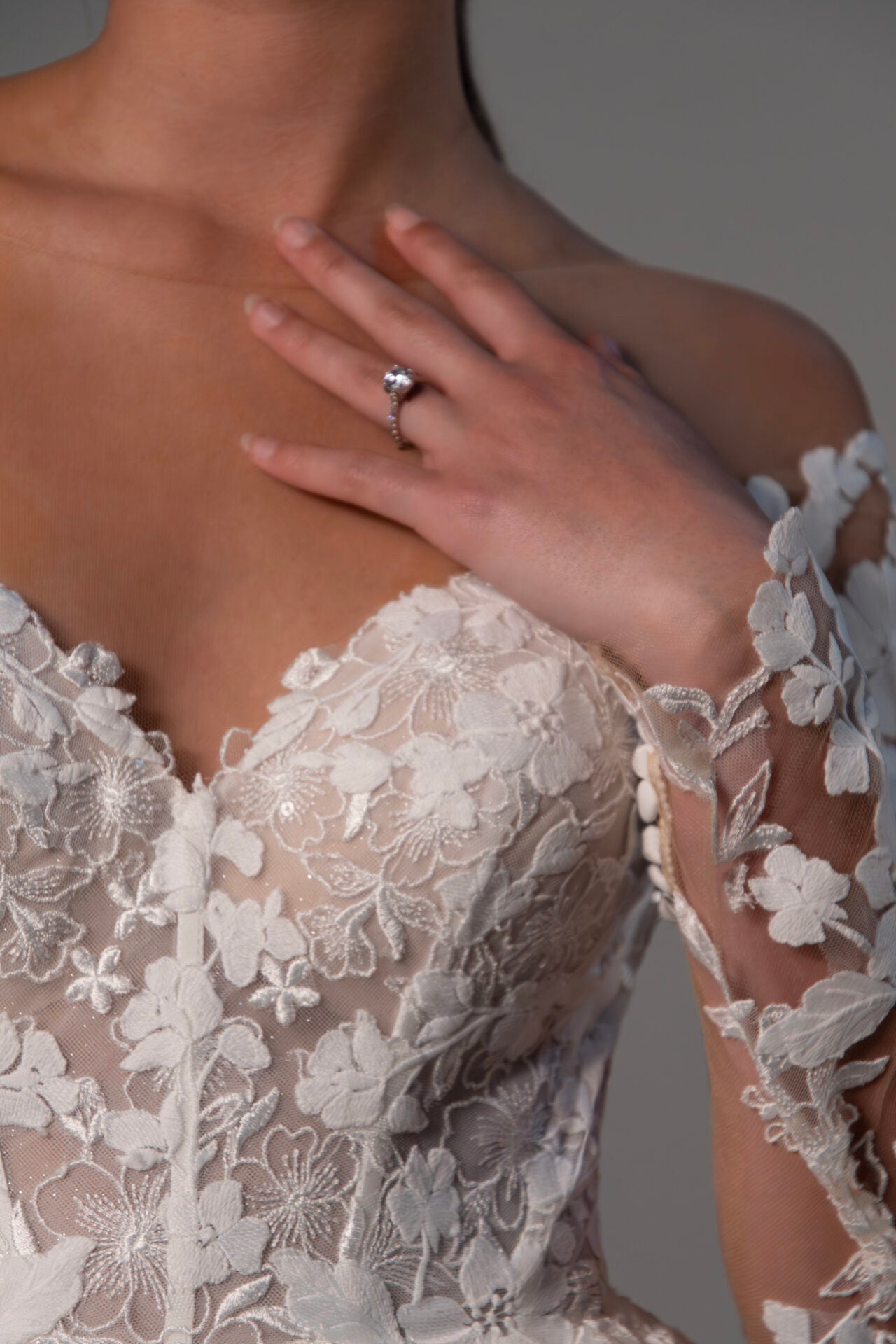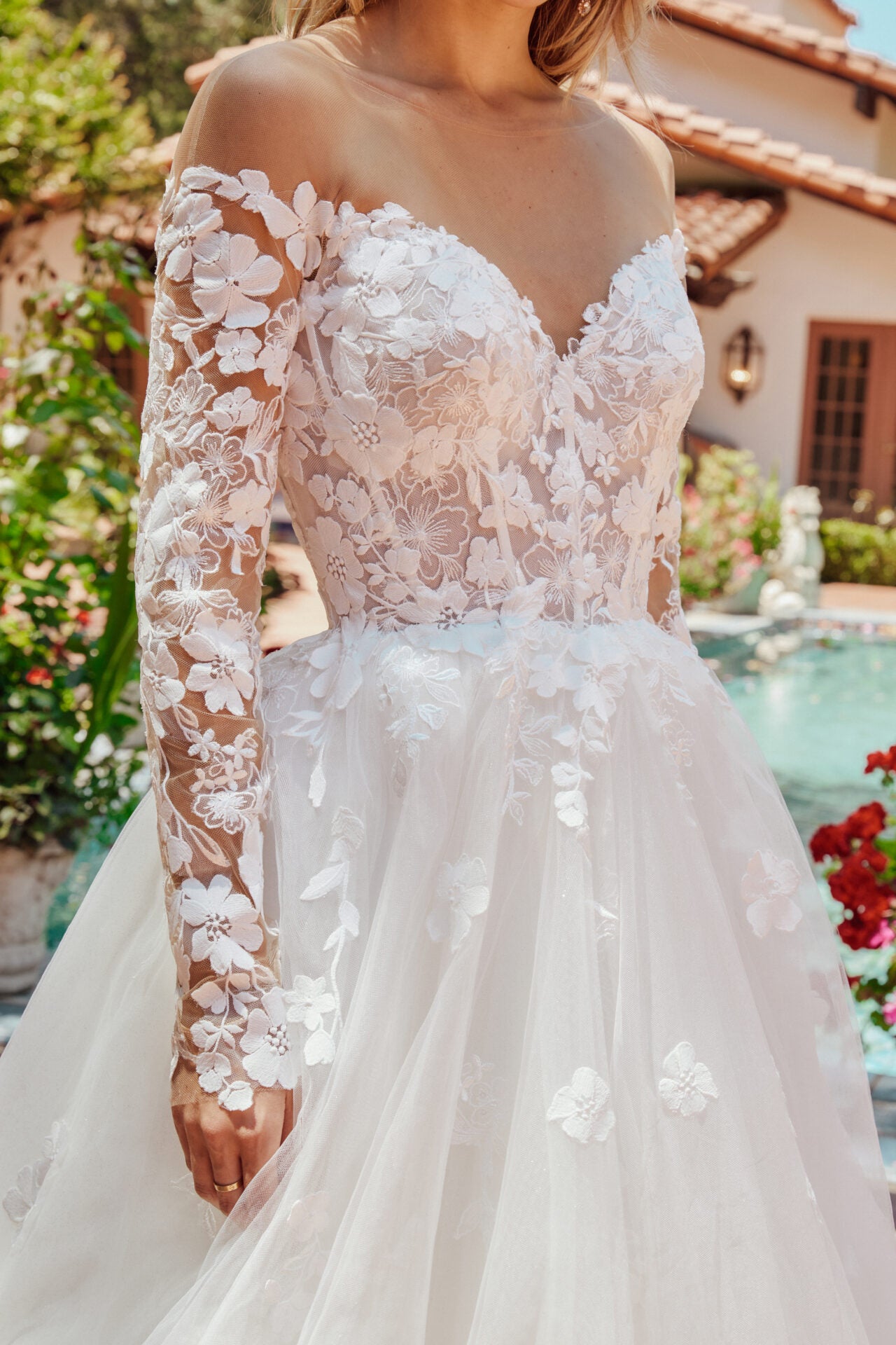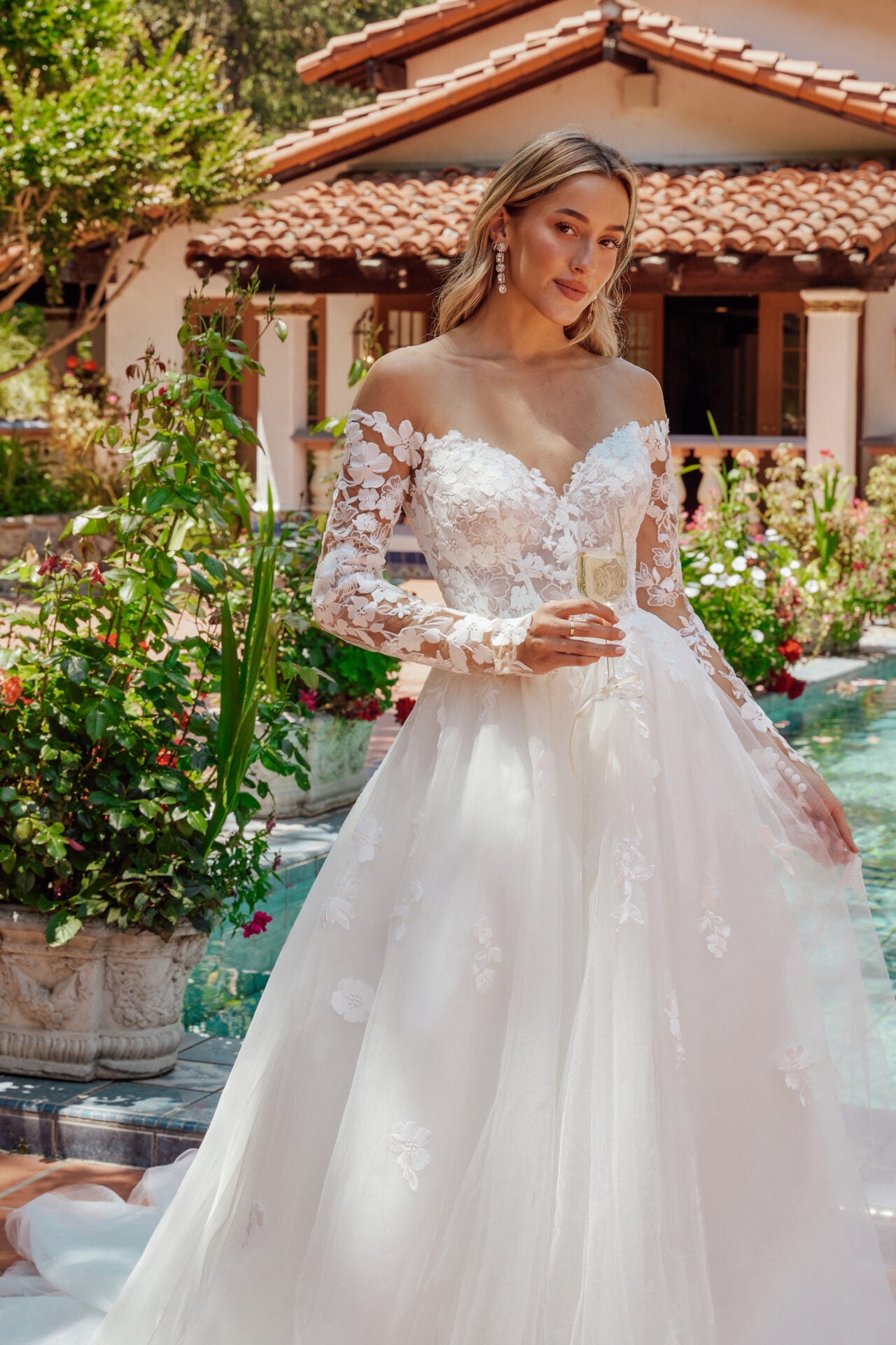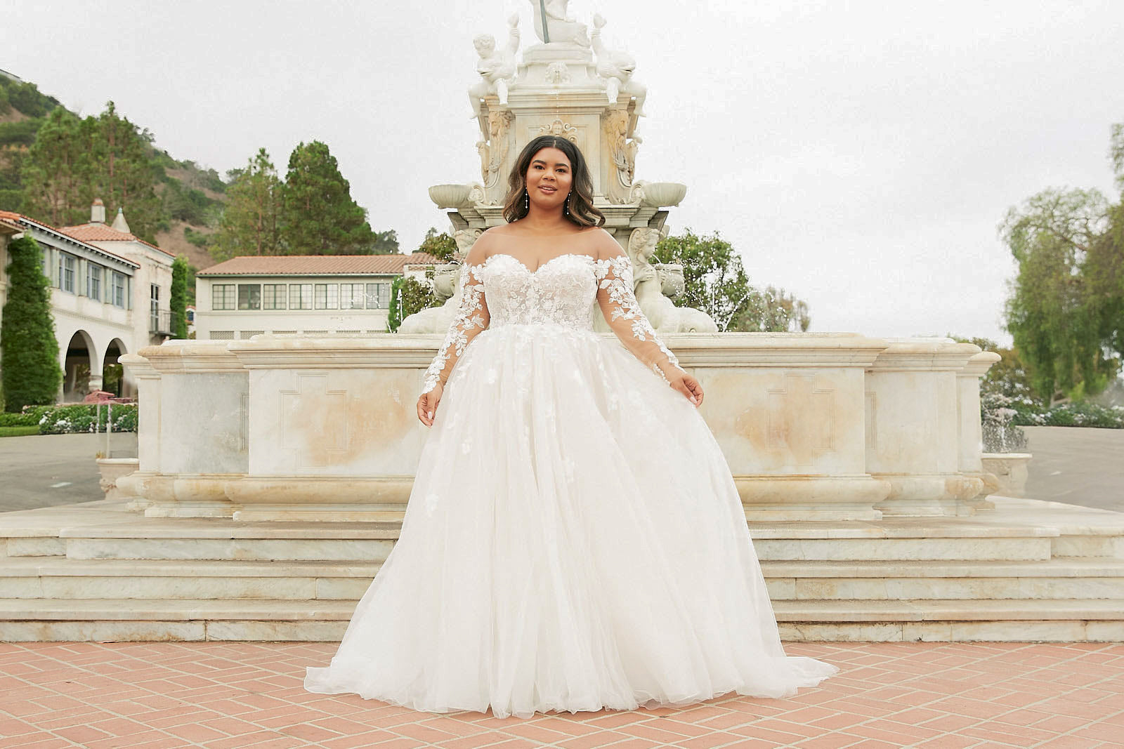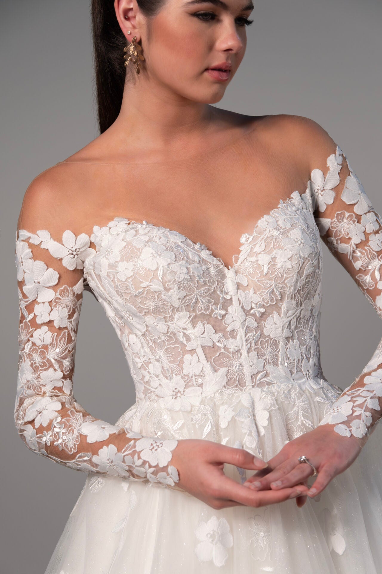A dreamy lace ballgown wedding dress that embodies regal romance, Style 8012 captures the enchanting essence of a fairytale wedding. The princess ballgown silhouette features a sheer fitted bodice with a flattering sweetheart neckline and sheer floral lace off-the-shoulder long sleeves, offering a perfect blend of modesty and glamour. From the waist, flowing layers of delicate tulle cascade into a voluminous ballgown adorned with scattered lace accents. Combining timeless grace with modern design, this long sleeve wedding dress ensures a show-stopping entrance and an unforgettable walk down the aisle. This wedding gown is also available in plus sizes.