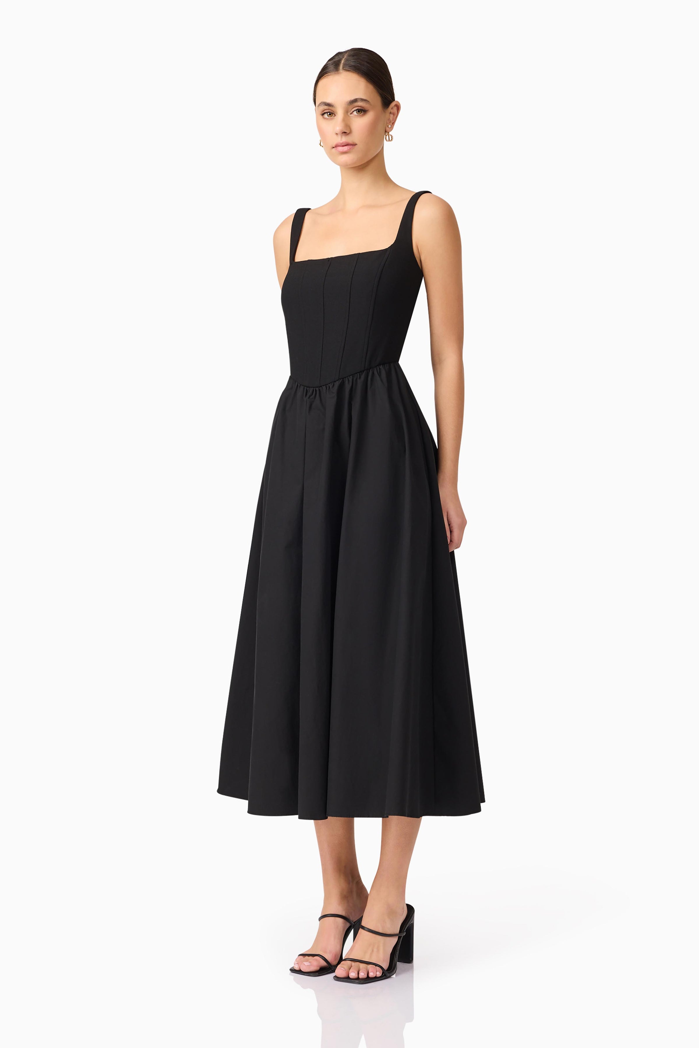 The Ingrid Corset Midi Dress in Black is the perfect blend of structured elegance and modern femininity. Designed with a striking square neckline, the bodice features intricate corset detailing that accentuates the figure, creating a flattering silhouette. The gathered A-line midi skirt flows effortlessly, offering both style and movement, while inseam pockets add a practical touch to this chic dress.