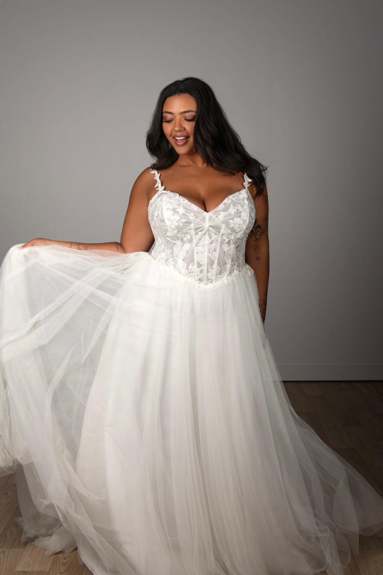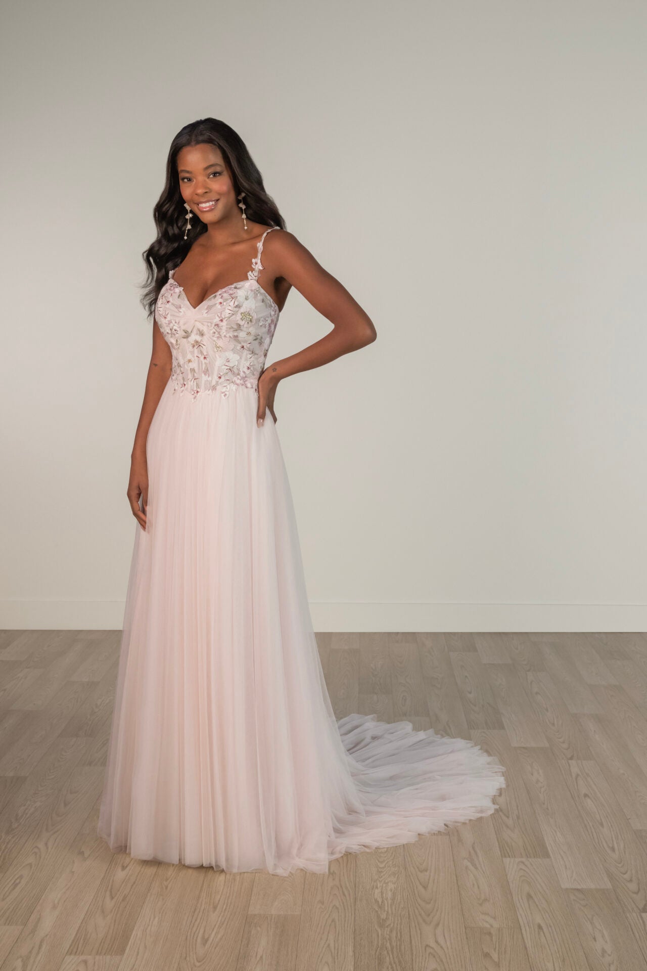 Capturing the essence of romantic bridal fashion, Style SY8113 enchants with its soft A-line silhouette and ethereal, colorful embroidered lace. Delicate, petal-adorned spaghetti straps lead to a deep sweetheart neckline, where a sheer bodice features a stunning twisted ruched knot detail. A subtly scooped back adds a hint of allure, while layers of frothy pink tulle cascade into a soft A-line skirt, creating a dreamy, weightless effect. This enchanting dress is a breathtaking blend of whimsy and elegance for the bride who embraces playful romance. This gown is also available in plus sizes and with a variety of bodice lining options.