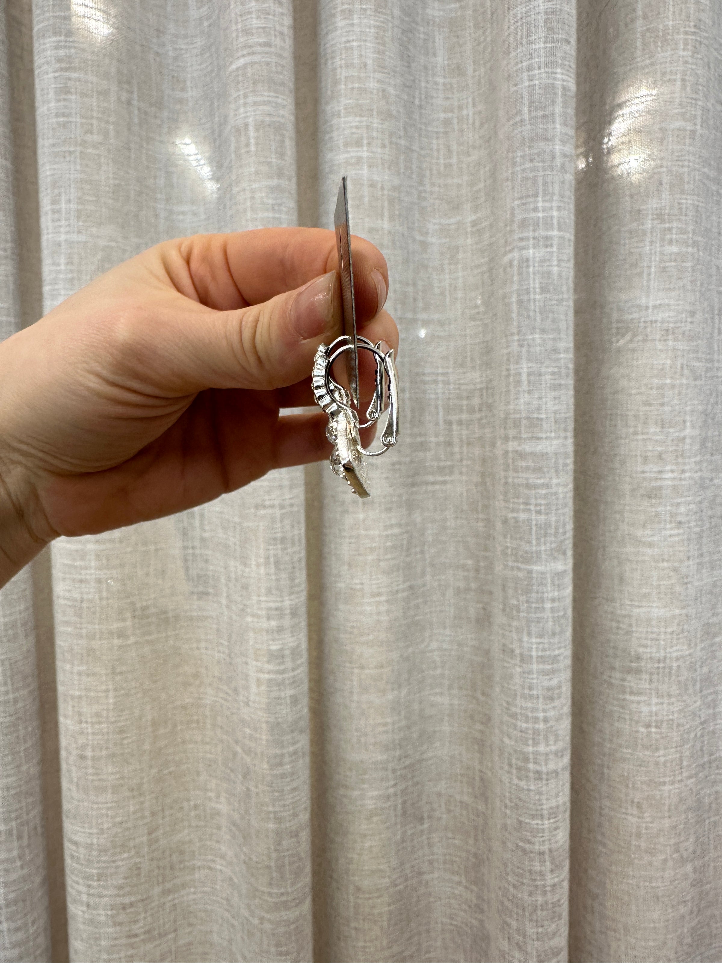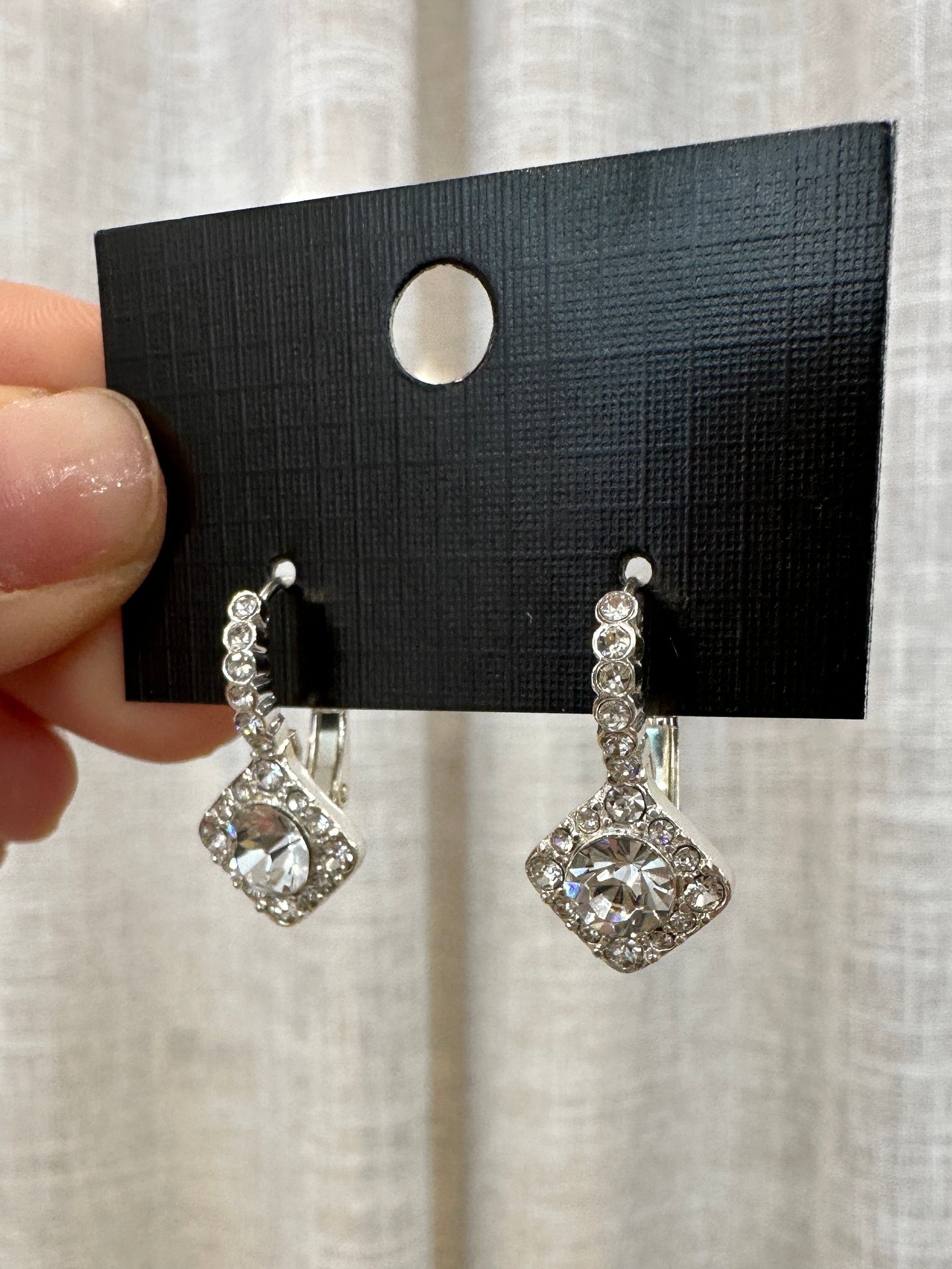 These stunning silver-toned earrings feature a graceful geometric design, adorned with shimmering stones that catch the light beautifully. Perfect for both casual and formal occasions, their elegant curve and secure clasp ensure a comfortable fit while adding a touch of sophistication to any ensemble.