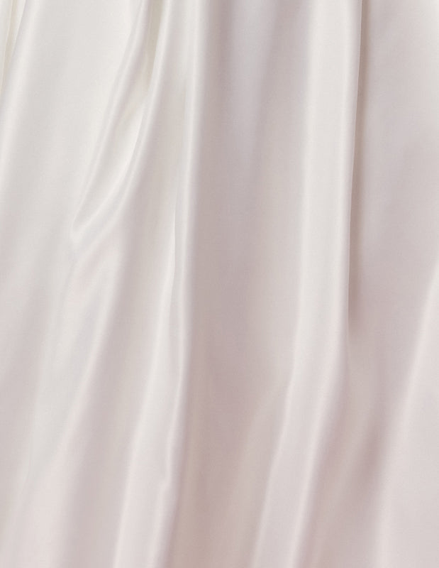 This chic one-shoulder satin A-line gown flows gracefully to the floor and features handy pockets. Ideal for brides who want a fuss-free wedding dress, a reception look that can keep up with the dancing, or a dazzling engagement outfit.