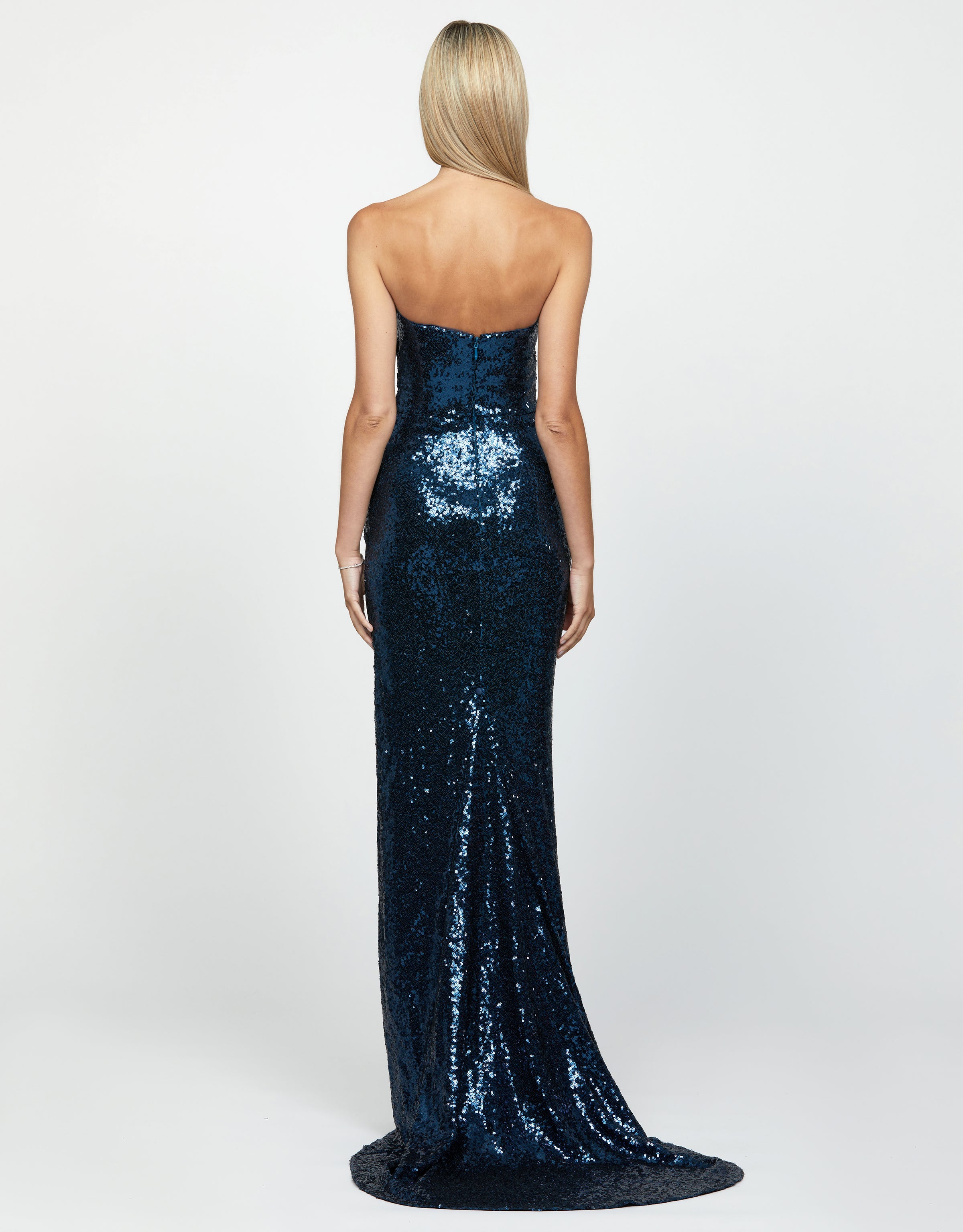 This asymmetric strapless dress features a trendy off-center top, chic skirt tucks, a alluring leg split, and dazzling sequins for a touch of glamour - it's the ultimate statement piece!