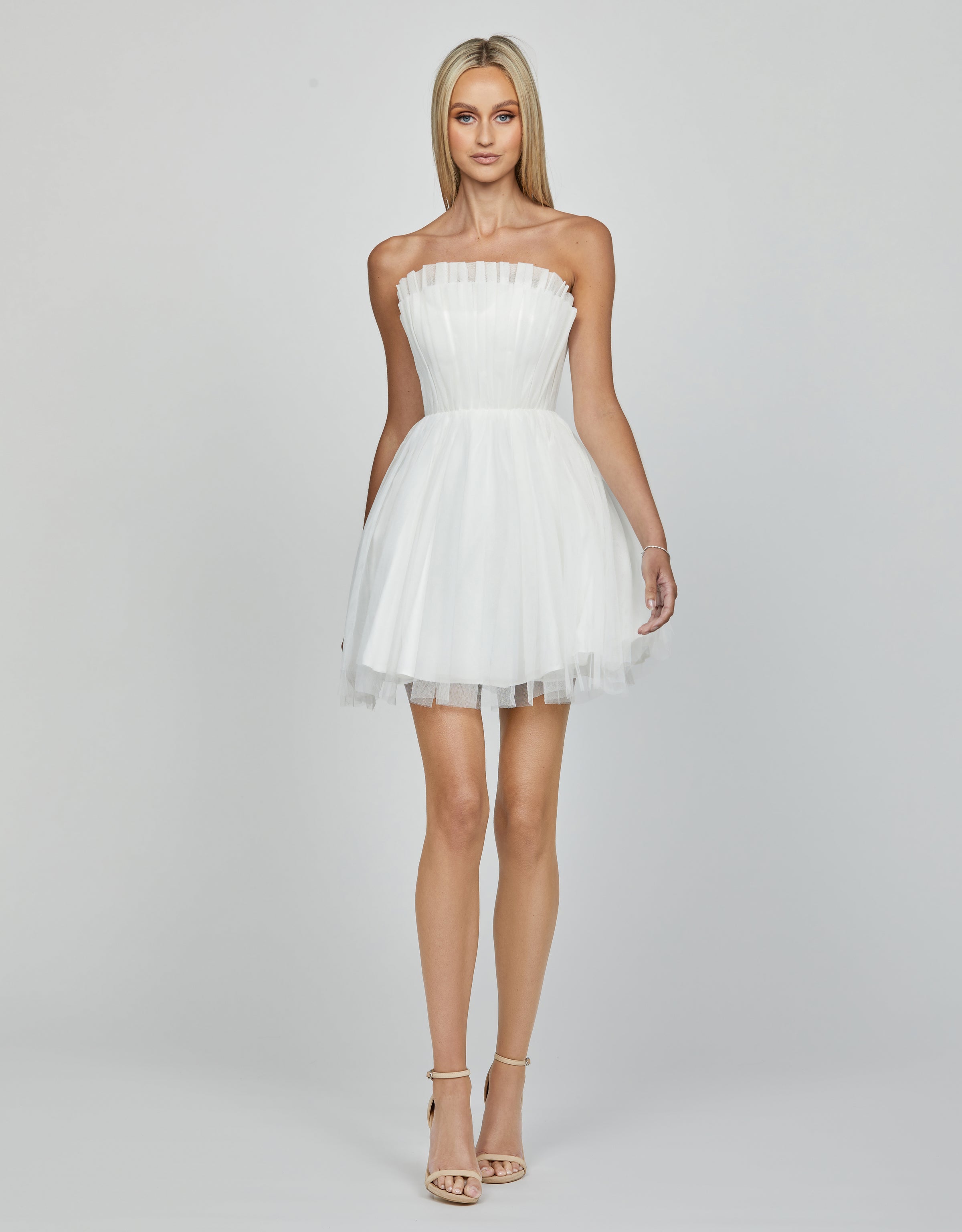 The Alondra Strapless Mini: a must-have for those who want to stand out from the crowd! With its ruffled bodice, mini skirt, and full skirt look, it's perfect for dancing the night away in your fabulous shoes. Whether it's a hens party or a reception, this dress brings the fun and flair.