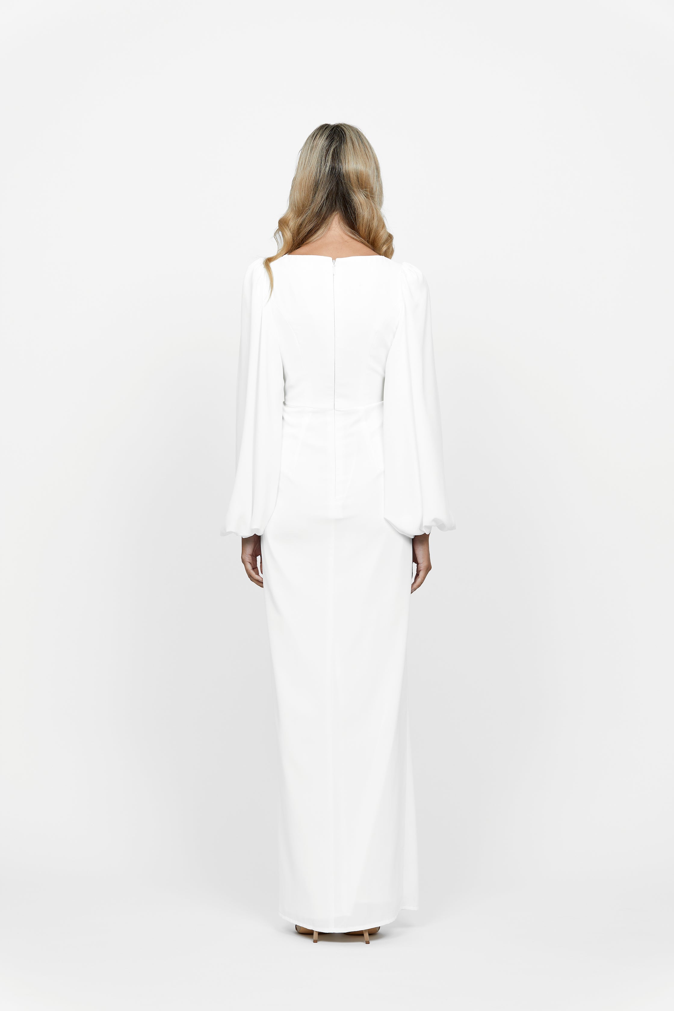 Make 'em stop and stare at your divine Candace Blouson Sleeve Plunge Gown! Stylishly tailored with a plunging V-neckline and billowy blouson long sleeves, this timeless evening stunner is sure to turn heads at weddings, parties, and any formal occasion. Plus, with a central draping on the skirt and front split opening, you'll be the bell of the ball!