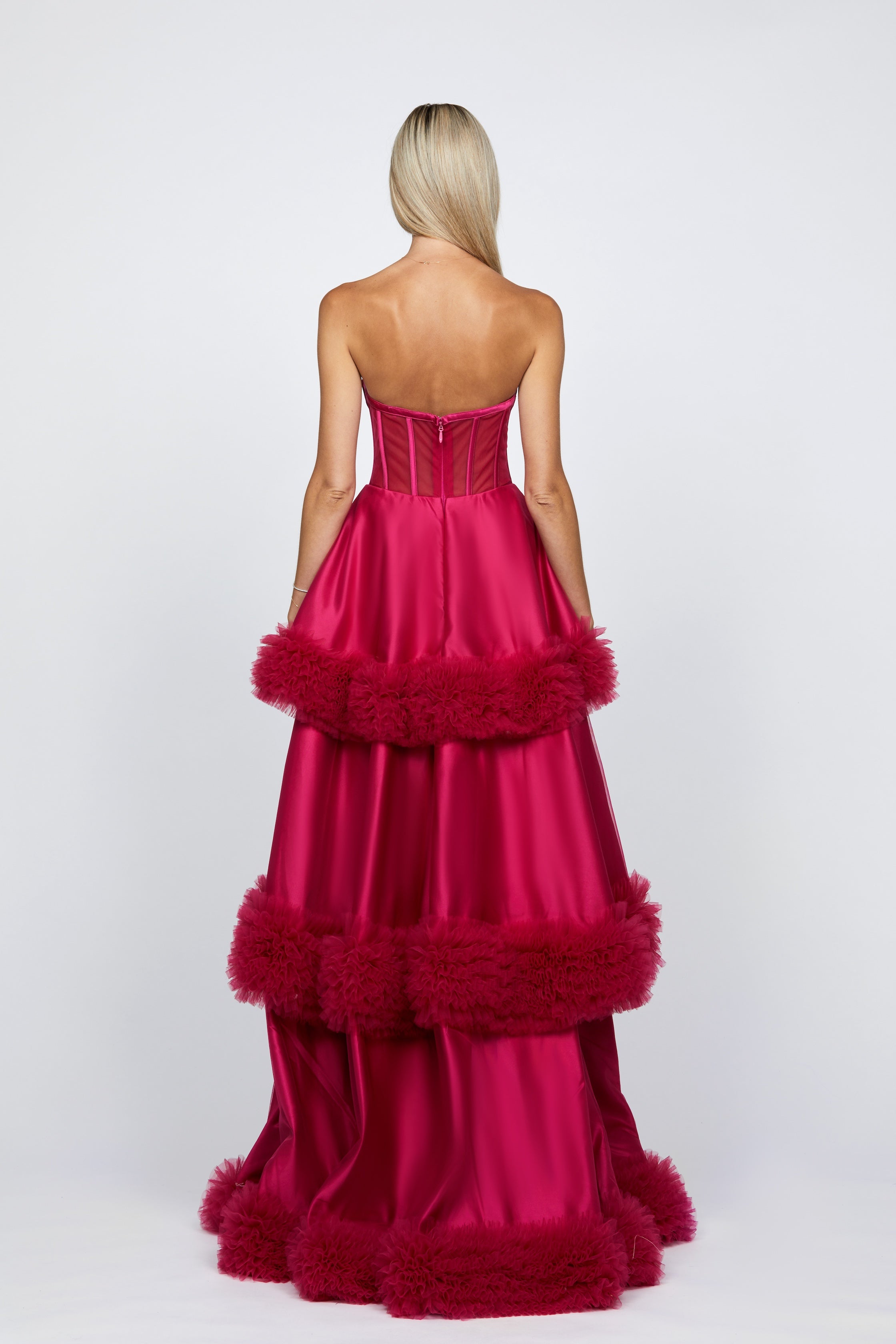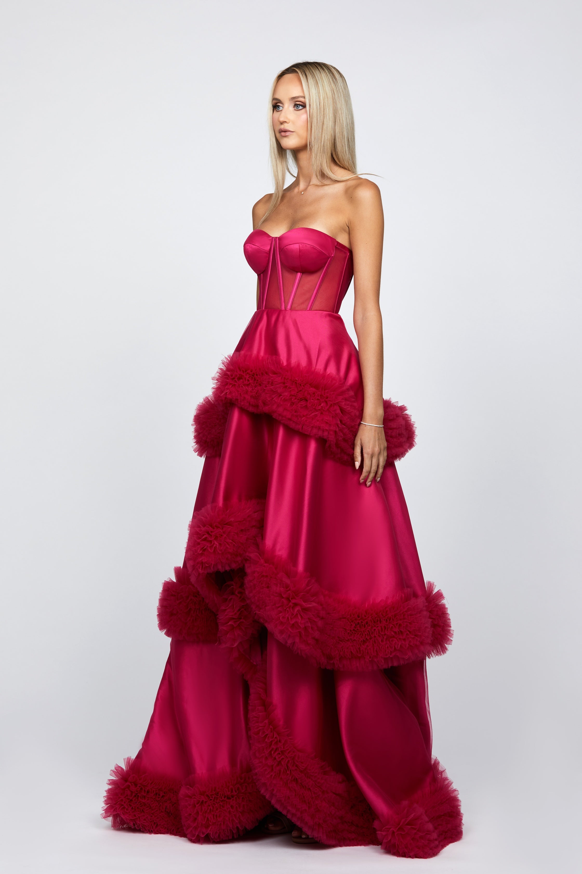 Get ready to turn heads in this stunning Mulligan Strapless Tiered Ball Gown! The sweetheart neckline, sheer waist panel, and corset detail provide a flattering fit, while the tiered ball skirt with gathered tulle ruffle at the hem adds a touch of whimsy. An invisible zip closure at the back and built-in bust cups ensure a comfortable and secure fit. You'll feel like a princess in this playful and unique gown.