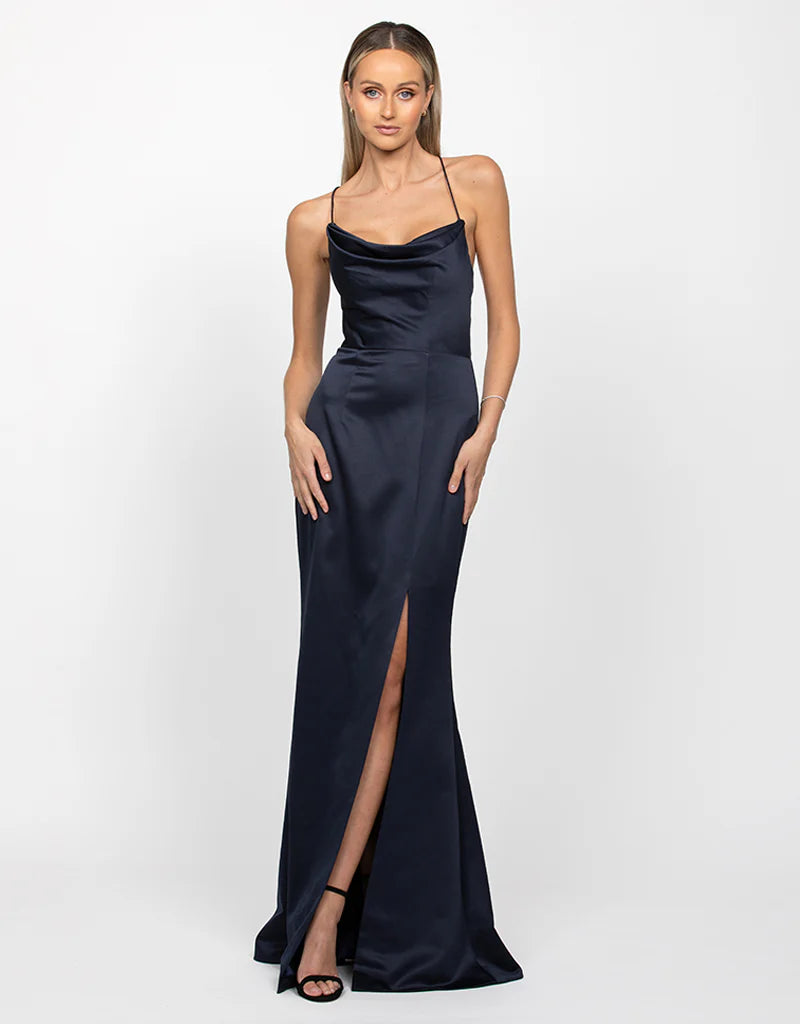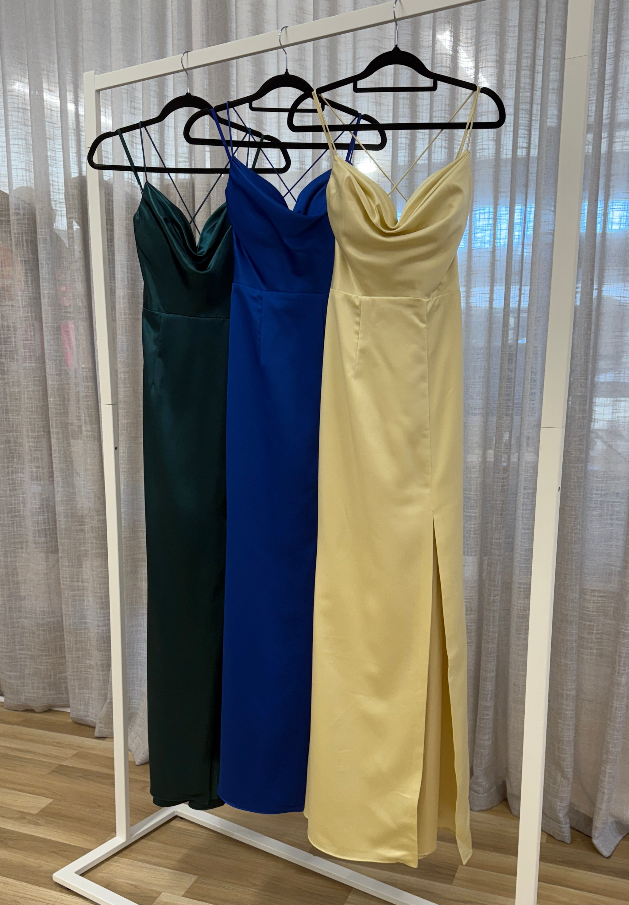 Looking for a unique and stylish gown for your special day? Look no further! Our Stephanie gown is now available for custom orders! This beautiful satin dress features a trendy cowl neckline, a tie-up back for the perfect fit, and a slim fit bias cut design. With a fitted bust and hidden zipper, this gown is both flattering and comfortable. Plus, the cowl neckline adds a playful and elegant touch. Perfect for brides and bridesmaids alike!