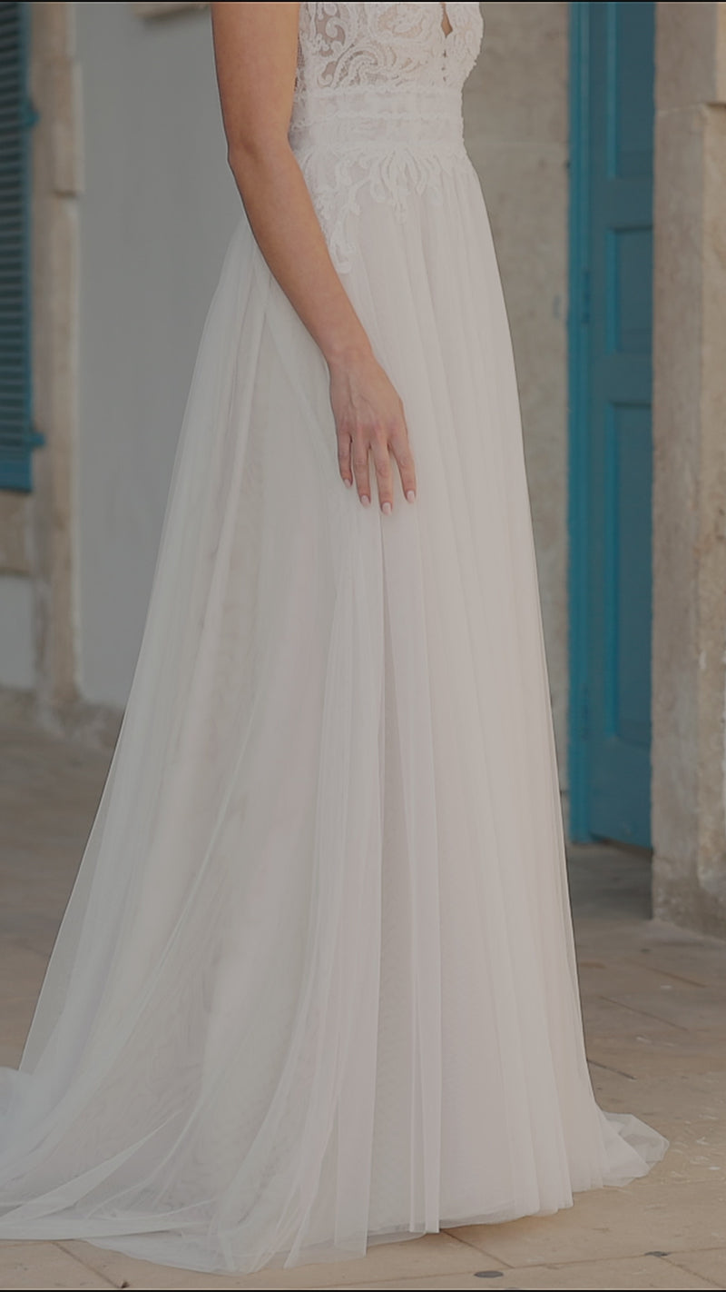 The plunging neckline is framed by delicate lace appliqués and subtle beading, drawing the eye upward and creating a flattering, elongated shape. The sheer tulle bodice offers gentle structure, flowing seamlessly into a soft A-line skirt made from layers of airy tulle that move beautifully with every step. A low back adds an elegant finishing touch, while the medium-length train brings just the right amount of drama without overwhelming the look.