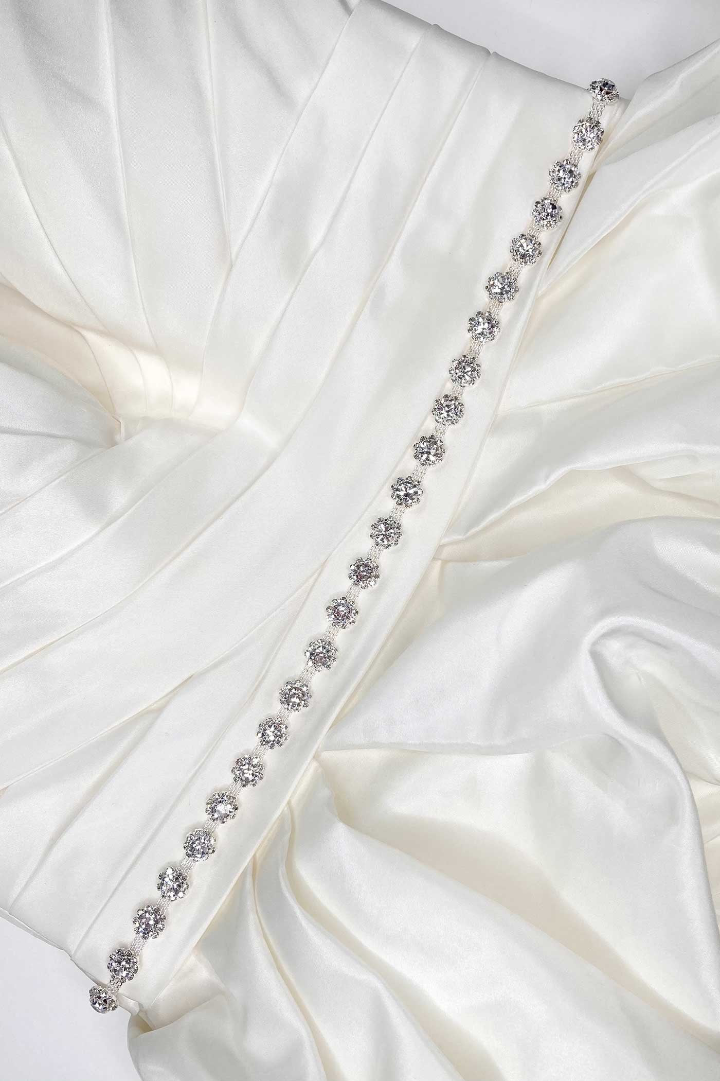 This piece is the perfect narrow chain belt for brides who want to add a little more sparkle to the bridal look.