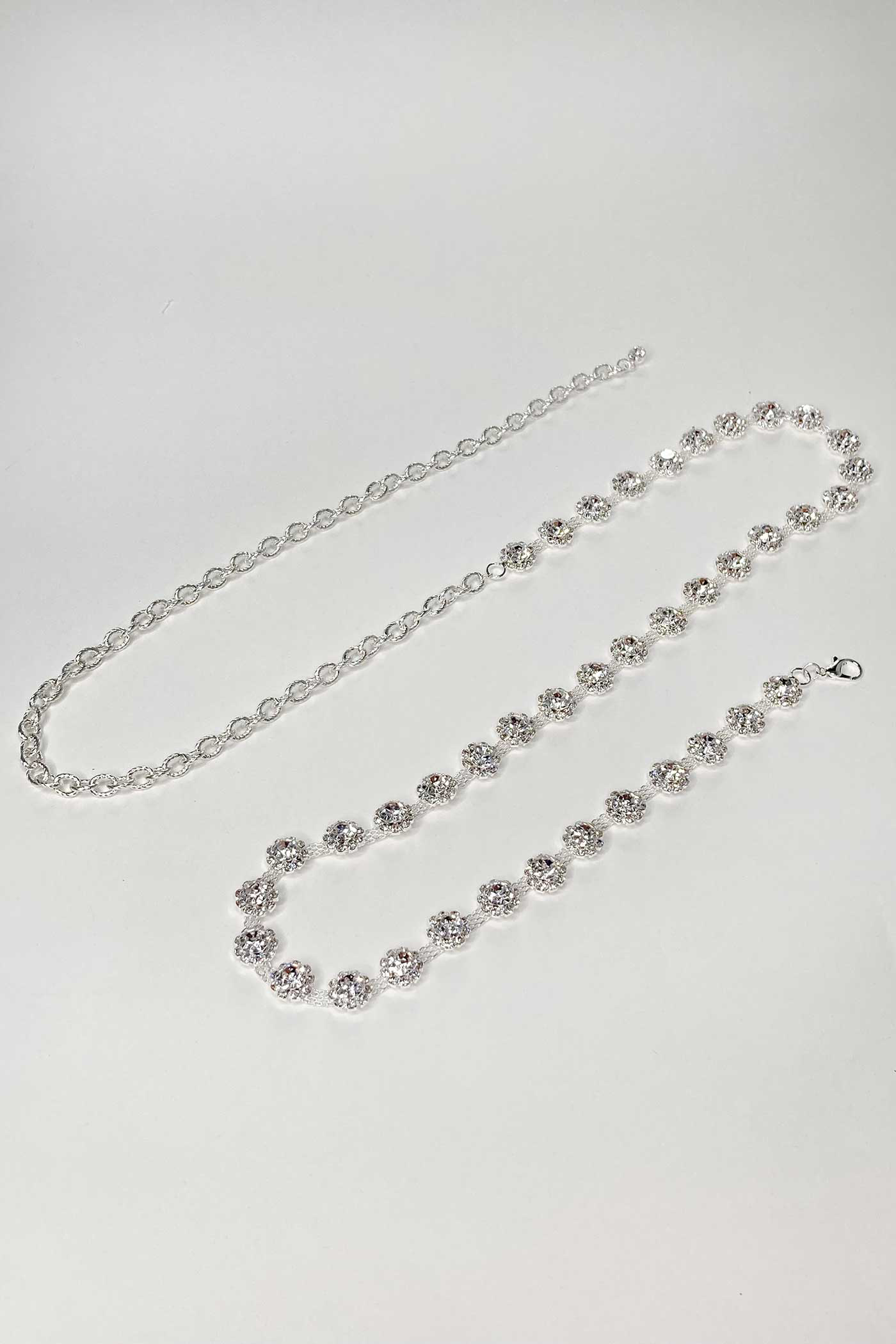 Our Amour Belt is a narrow chain belt featuring elegant floral crystal motifs. The decorative details on this belt extend across 60 cm of the chain with a 40cm extension chain tail finished with a single crystal.
