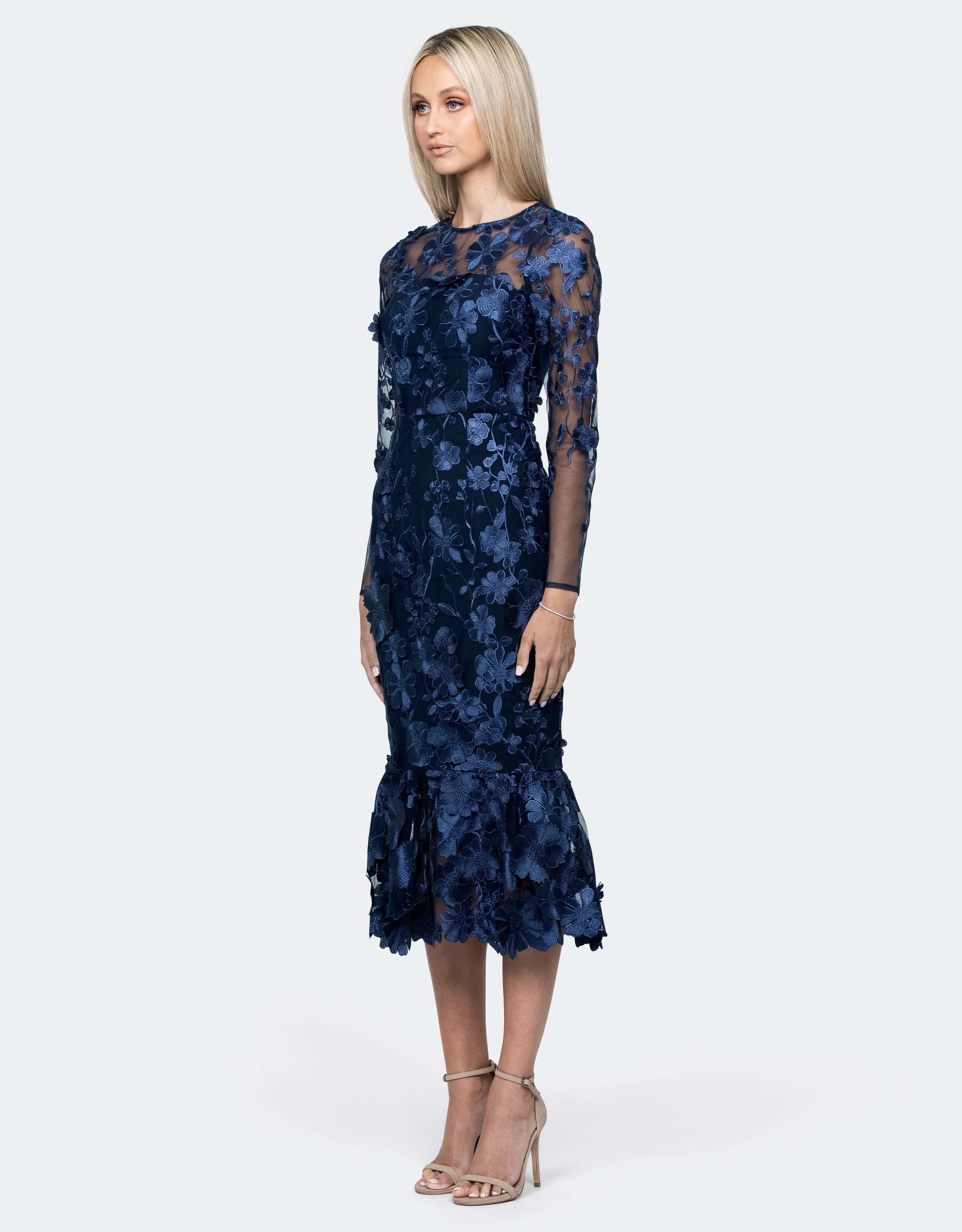 Command attention in this stylish dress with a high neckline for a sophisticated touch. The straight-across underlining adds structure, while the sheer long sleeves bring a hint of allure. The fitted midi skirt boasts a ruffled hem panel, blending elegance with a touch of playfulness. This dress is a perfect choice for those seeking a chic and versatile ensemble, effortlessly combining modern design with classic charm for various special occasions.