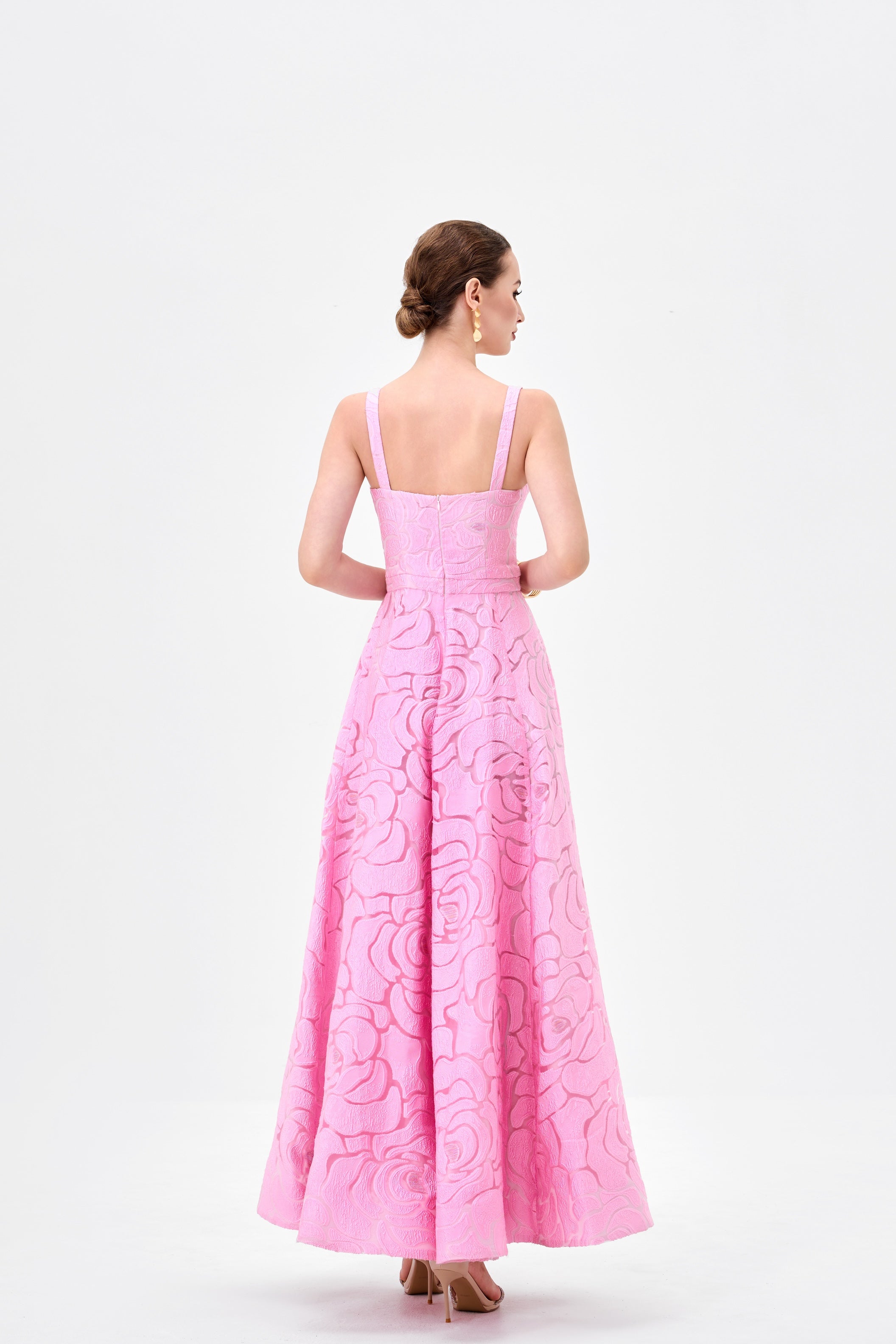 This romantic maxi dress is crafted in a textured rose burnout jacquard, designed to make an elegant statement with a timeless silhouette. Featuring a structured square neckline and wide shoulder straps, the fitted bodice is shaped with hidden boning and a defined waistband for a flattering, supported fit. The look flows into a full A-line maxi skirt with soft pleat detailing, creating beautiful movement and volume. Fully lined for comfort, the style is finished with an invisible zip closure at the back for a clean, seamless finish.