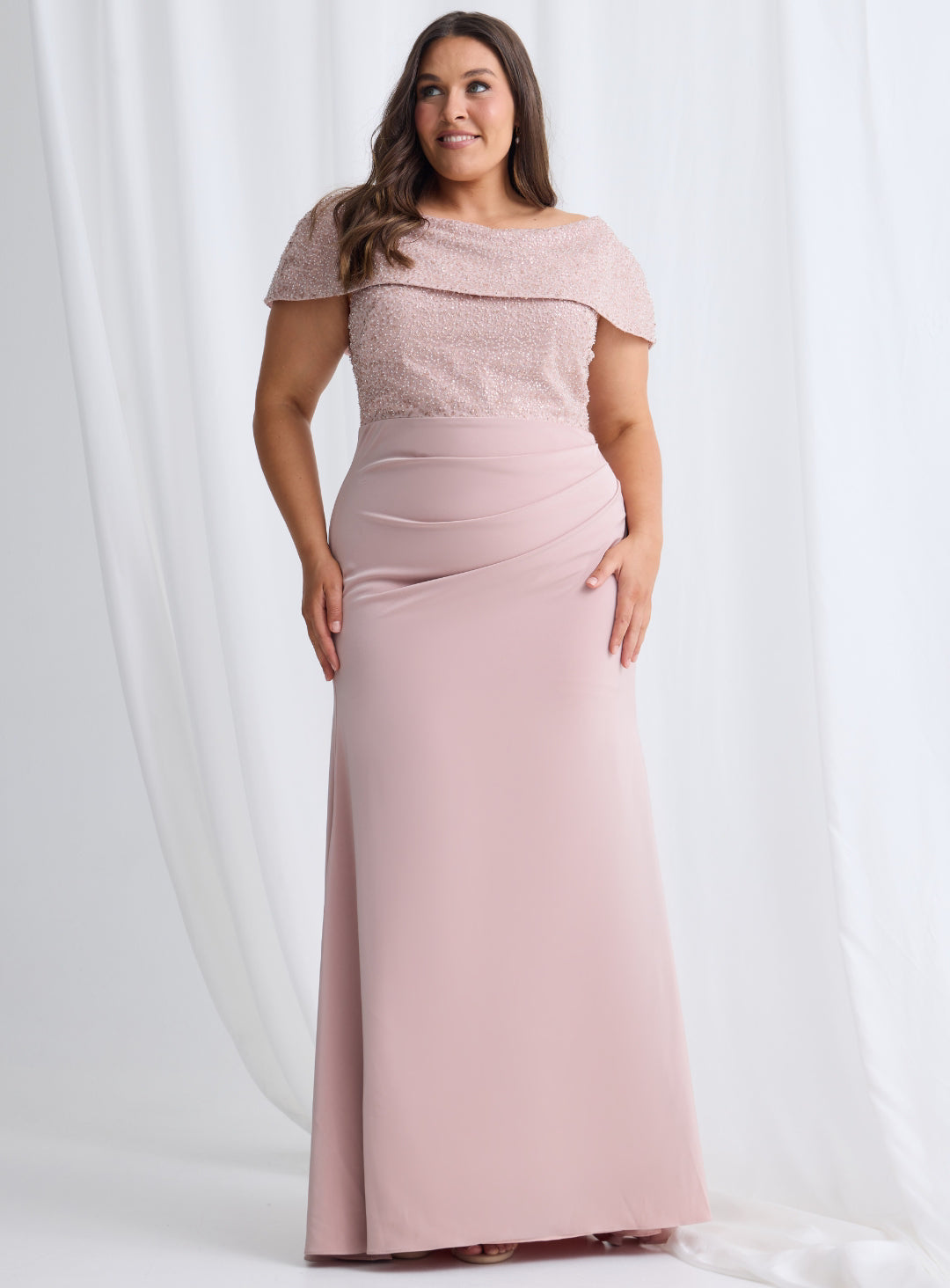 The bodice is crafted from a delicate beaded fabric, finished with an off-the-shoulder overlay that softly frames the neckline and shoulders. The skirt falls gracefully in a woven satin crepe, featuring subtle ruching through the waist and hips to enhance and flatter the silhouette without feeling restrictive.